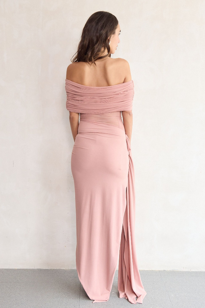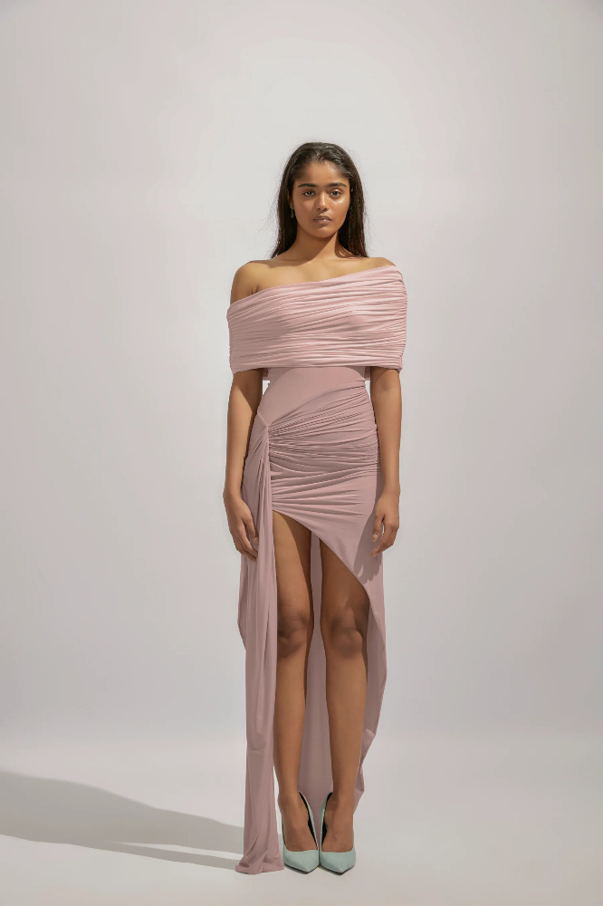 Embrace elegance in this off-shoulder dress, showcasing intricate ruching across the bust and waist for a figure-enhancing silhouette. The addition of a side drape adds drama and movement, while the daring high slit offers a touch of allure. Perfect for special occasions, this dress exudes sophistication and glamour, ensuring you stand out with effortless style.