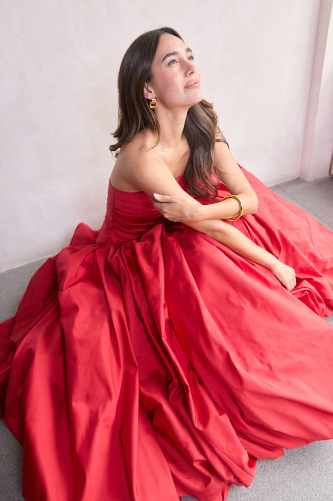 Elegant strapless red dress. The bodice extends down to the hips to accentuate the silhouette, while the skirt features a balloon-style design that tapers at the hem.