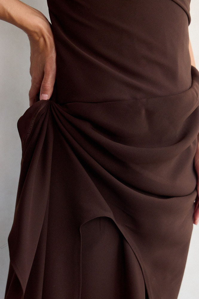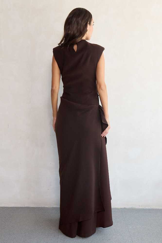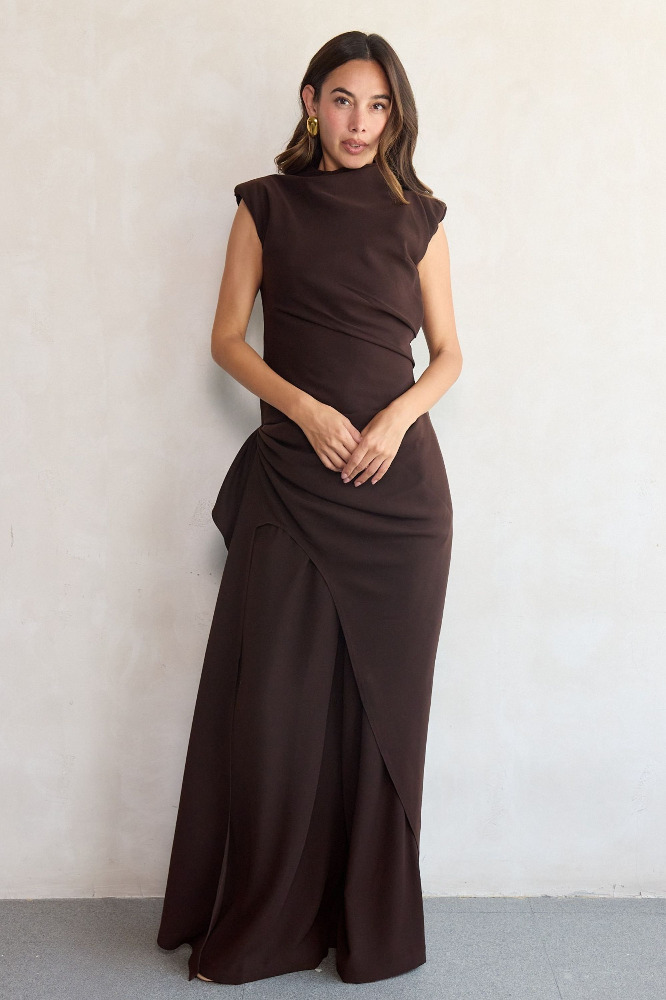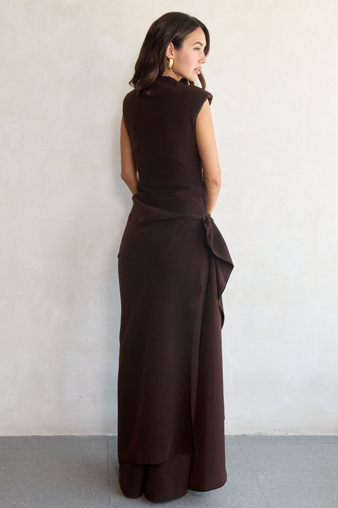 The look features an asymmetric draped long top with soft pleats that gracefully fall along the body, adding texture and movement. It's paired with flared, low-waisted trousers that offer a streamlined, tailored silhouette, enhancing the overall refined aesthetic. The ensemble is finished with a striking trench coat, highlighted by bold, oversized collars that bring a touch of drama and sophistication.