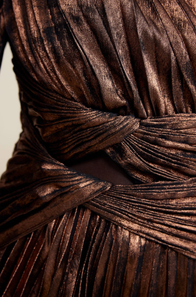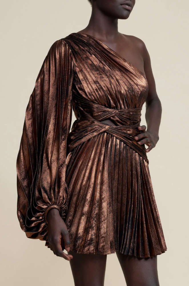 The Auroa Mini Dress in Bronze embraces texture and volume. Designed to make a statement, this silhouette is complimented with a single sleeve design, abstract gathering through the waist, subtle front bodice cut out and our signature pleated fabrication. - Mini dress - Lined - Invisible side zip - Button cuff closure Composition: 100% Polyester