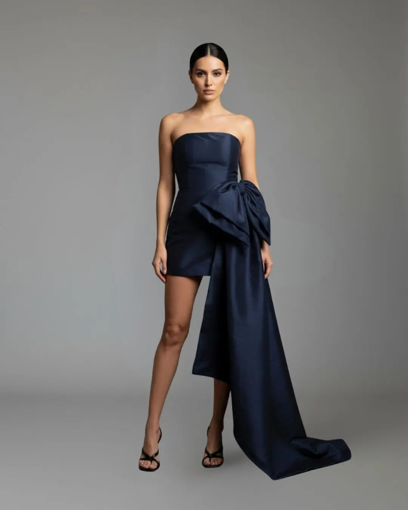 El “Vestido Barbie” es una pieza que busca causar un impacto con su atractivo color. Presenta una silueta mini sin tirantes. Su estilo ajustado abraza el torso de forma favorecedora y añade un toque romántico. La falda del vestido tiene un lazo exagerado que cae dramáticamente sobre la pierna. El material es 100% seda y no se estira. Cierre con cremallera en la parte trasera.