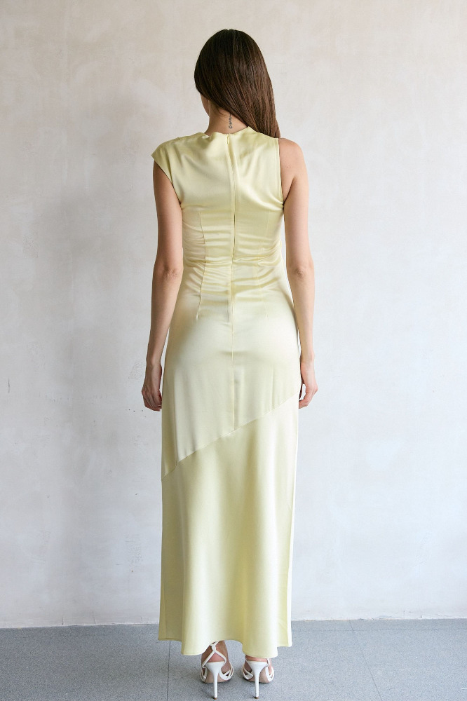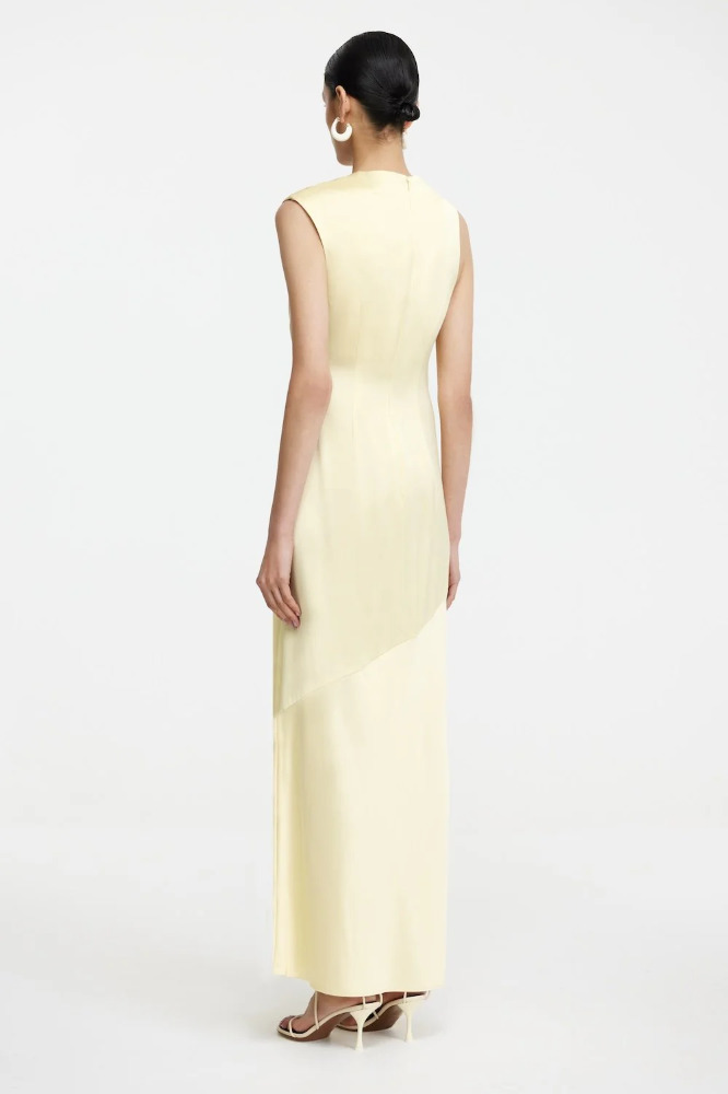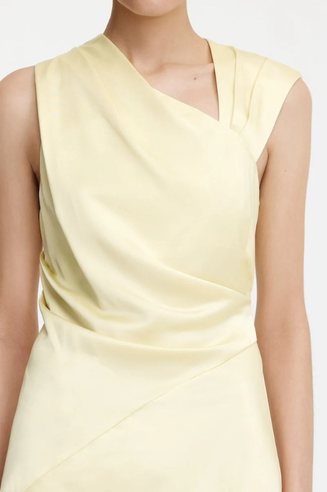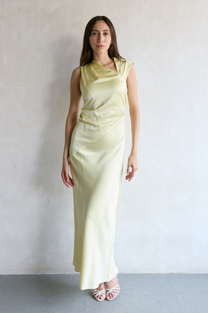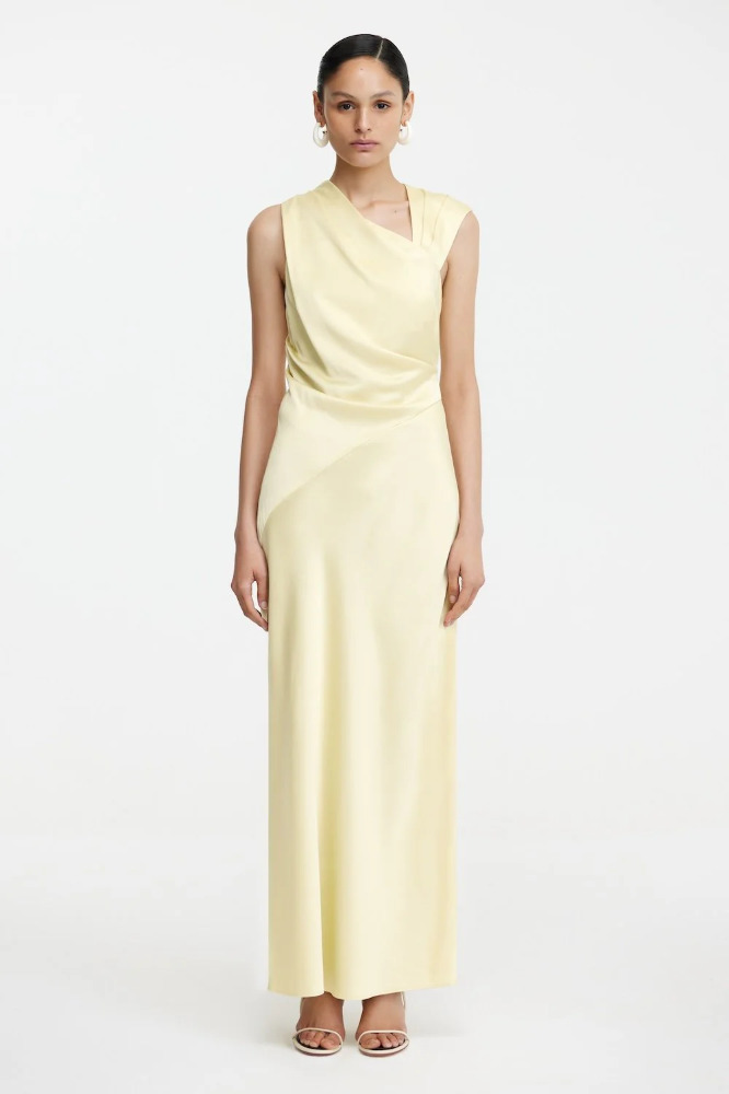 Sleek and contemporary, the Becca Maxi Dress in Butter exudes effortless elegance. Designed with an asymmetrical neckline and shoulder details, this style features flattering tucks through the bodice and a bias-cut skirt for a fluid silhouette that draped to the ankle. Perfect for evening events or formal occasions, the Becca Maxi Dress is your go-to for understated sophistication.
