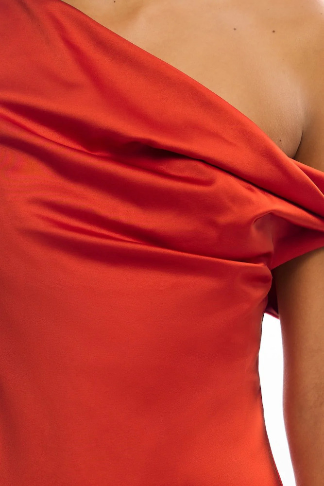 Effortlessly chic, the Becca Mini Dress in Chilli is designed to make an impression. This style features a twisted, pleated neckline that drapes off one shoulder and is elevated by twin rouleau straps that cross the open back. Perfect for evening soirées or cocktail events, the fully lined mini silhouette is both sleek and sophisticated.
