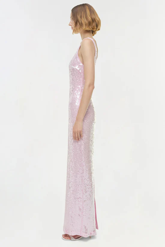 This tank-style maxi is adorned with a sea of sequins, catching the light for a subtle yet captivating sparkle. The sleeveless cut and gentle scoop neckline provide a tasteful simplicity, with a straight fit that elegantly traces the body’s lines.