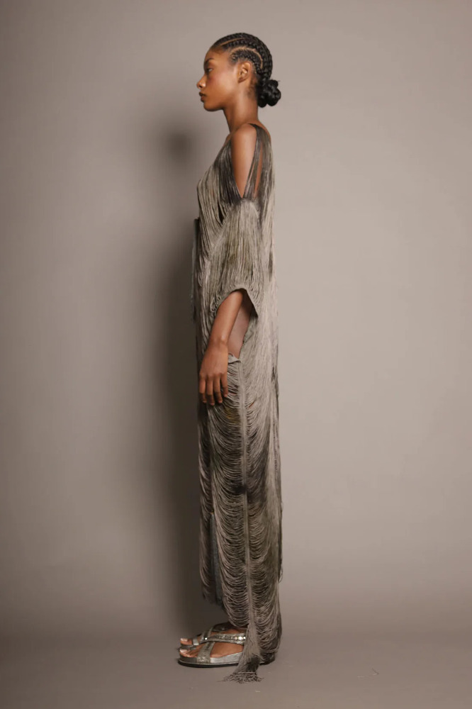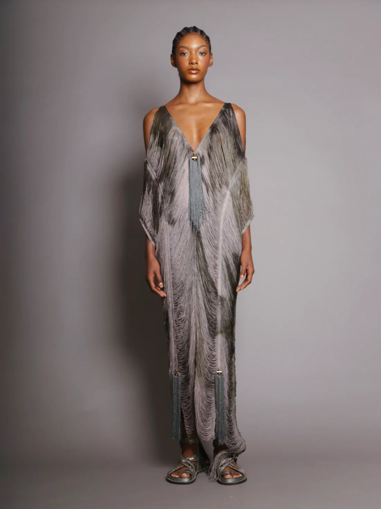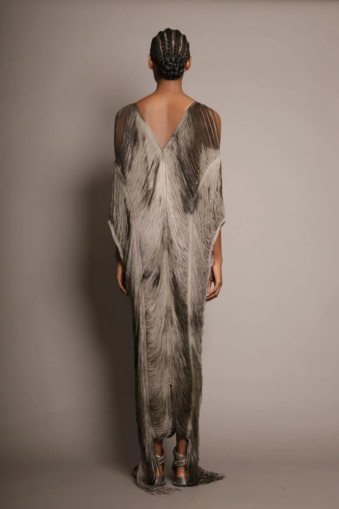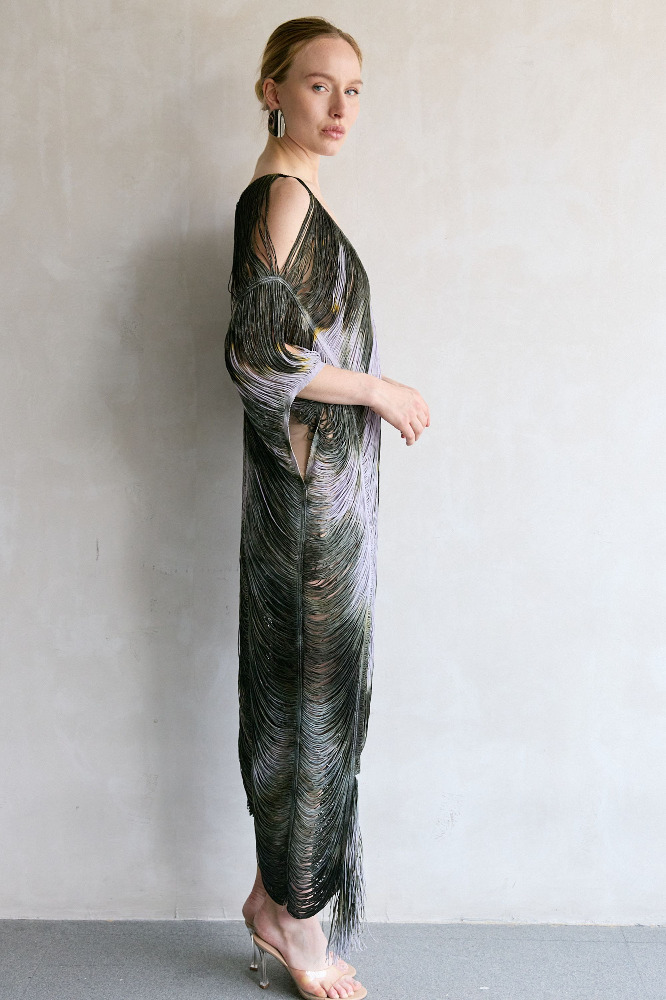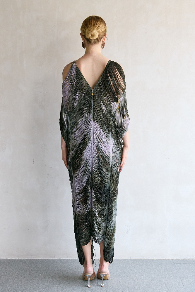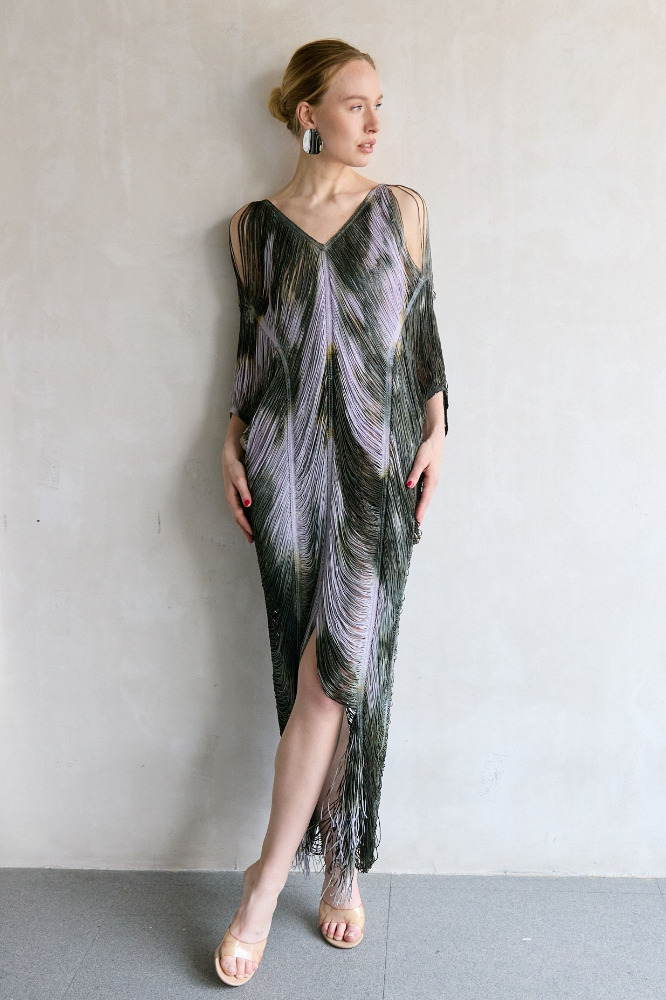 Handcrafted long kaftan with forest-silver fringe.