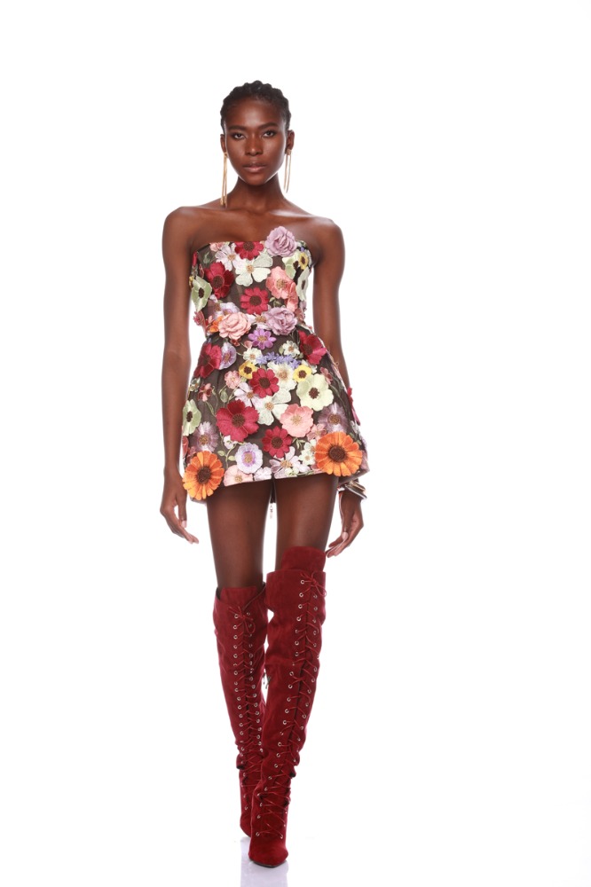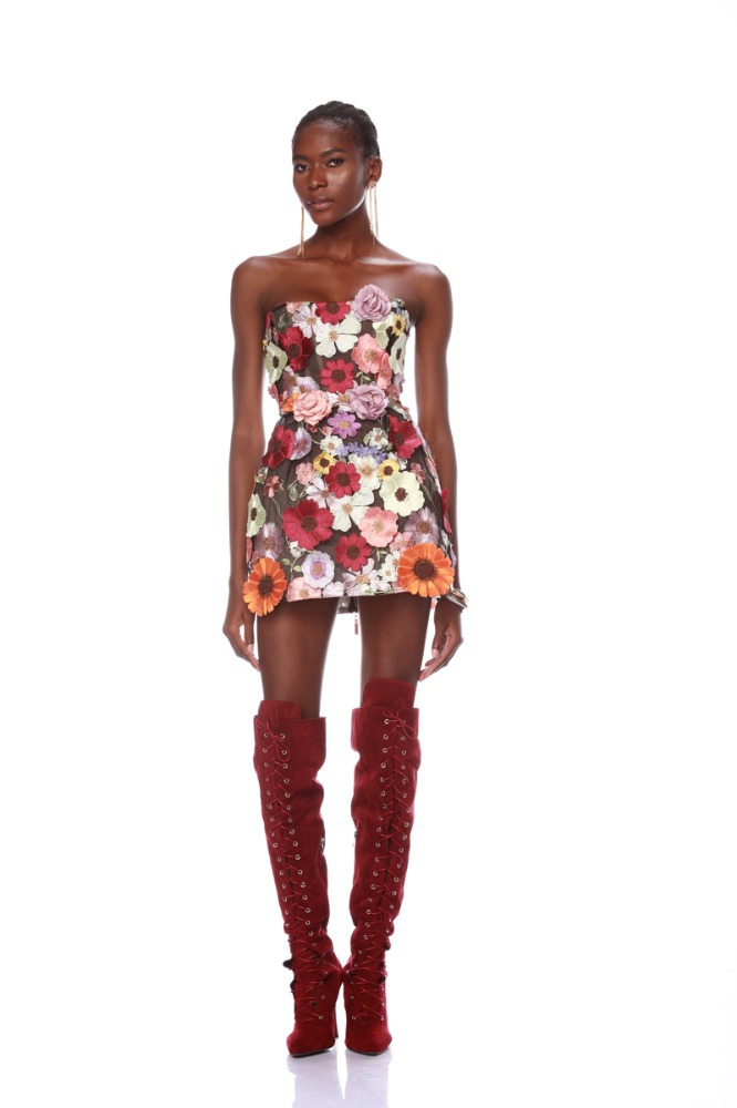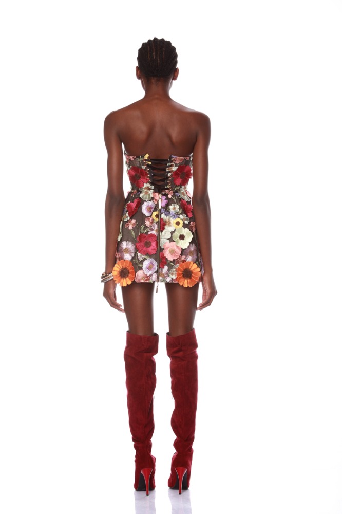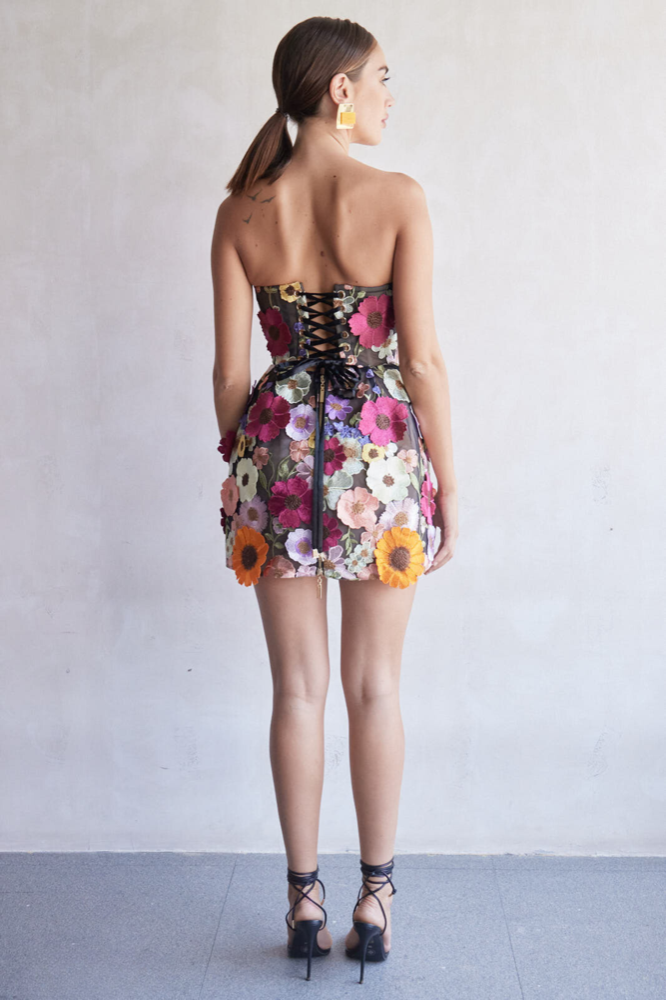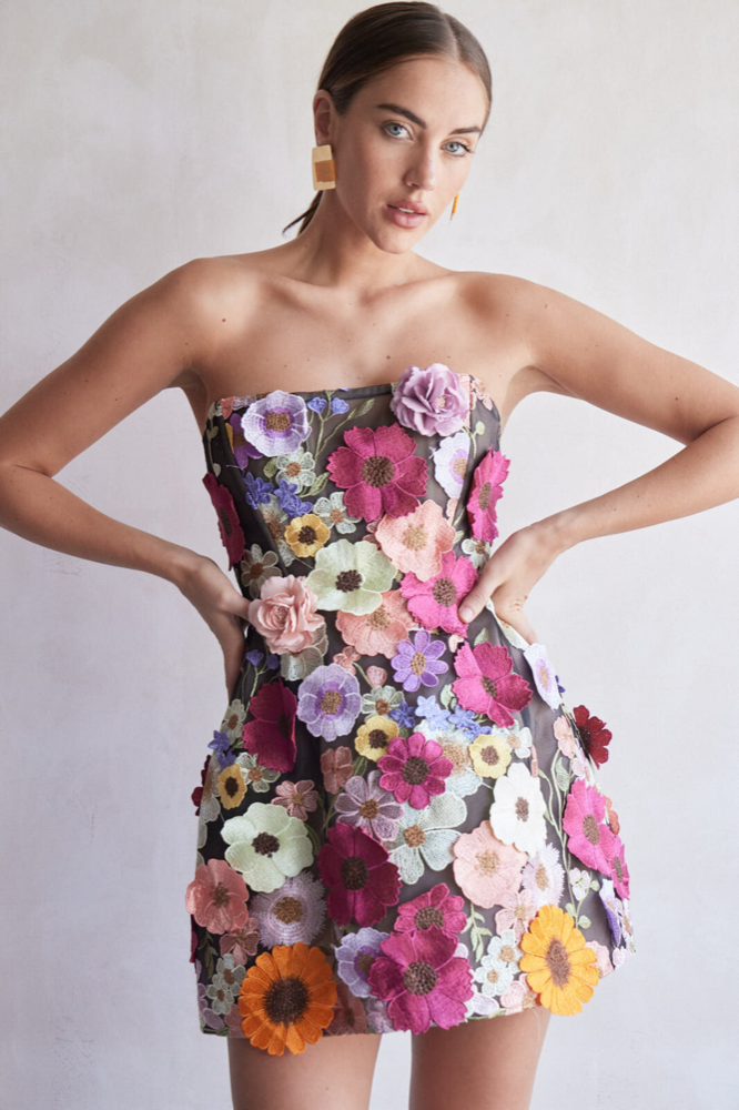 Dazzle in the Bouquet Maraya Mini Dress, a captivating blend of elegance and whimsy. Embellished with intricate floral appliqués and featuring a structured, boned bodice, this strapless sensation offers a flattering silhouette. With a corseted back and full lining, it ensures a perfect fit and undeniable charm for any special occasion.