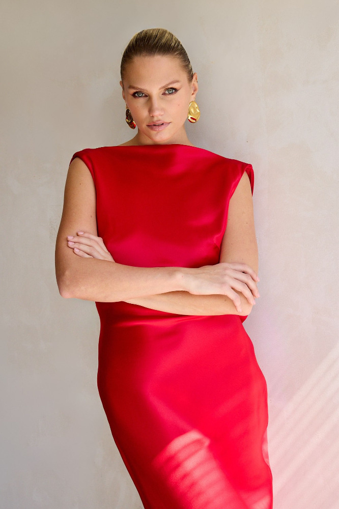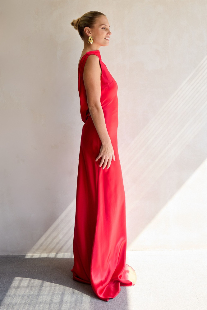The Callie Gown is a sculpturally draped, open back saton gown in a bias-cut fit, featuring extended tails that can be tied at the back..
