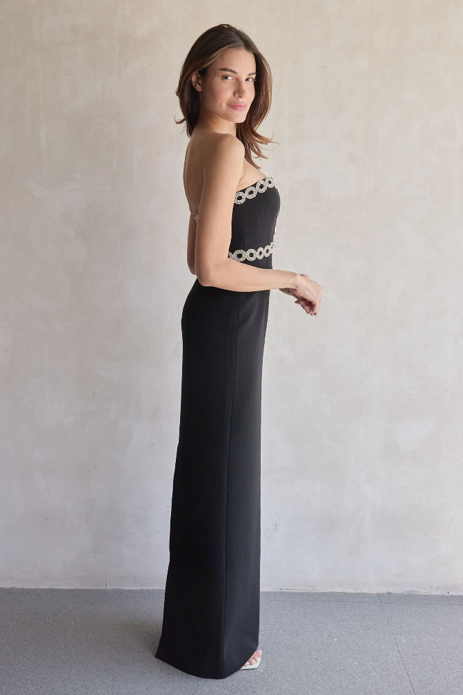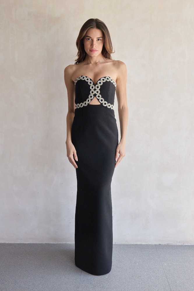 The Celinda Gown is a striking dress, designed for making a statement. Adorned with glamorous diamante trim embellishments, the strapless sweetheart neckline beautifully harmonises with the fitted bodice, enhanced with a front cut out for a chic touch. Cinched at the waist, the maxi column skirt creates a graceful and elegant silhouette, detailed with a back split for ease of wear. Fully lined and secured with an invisible zip fastening, this gown is a lovely choice for your next event.