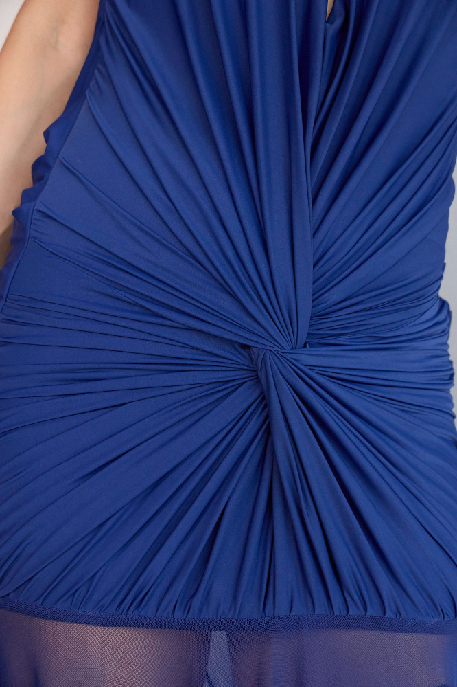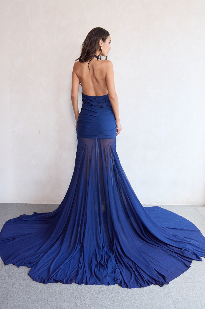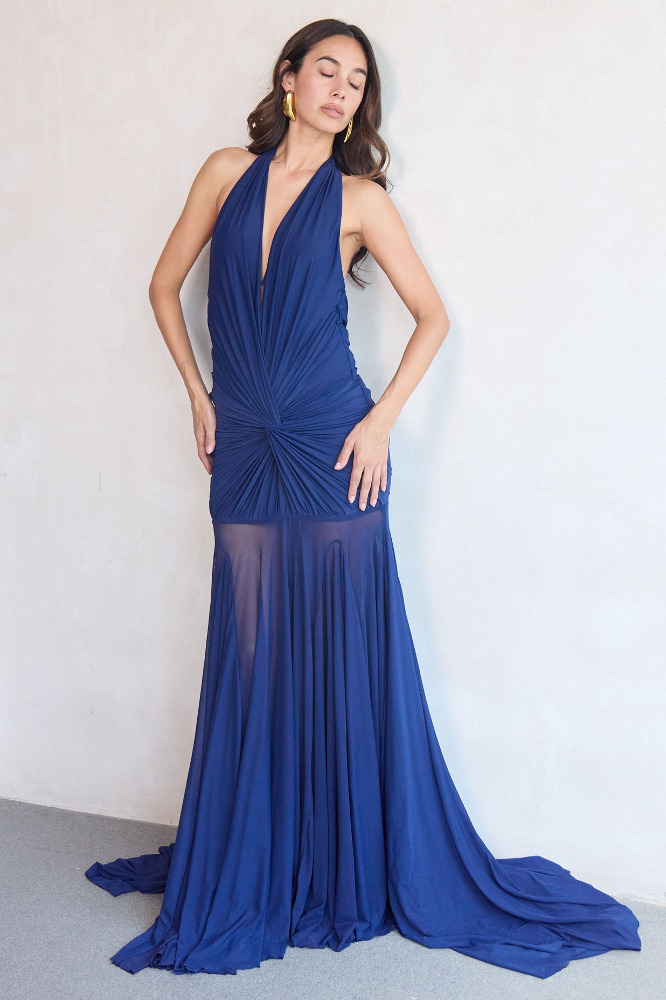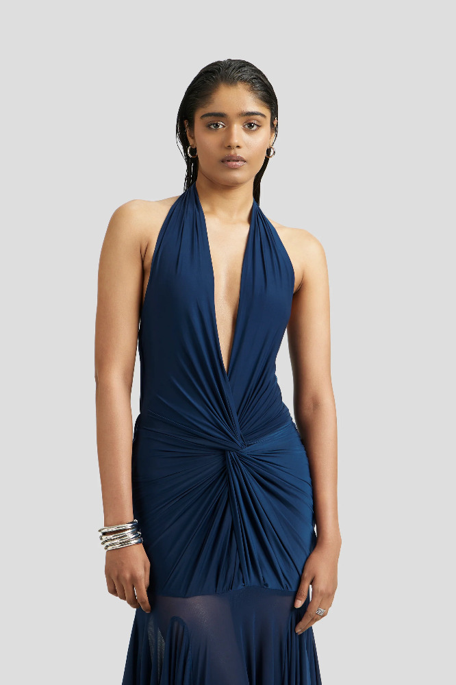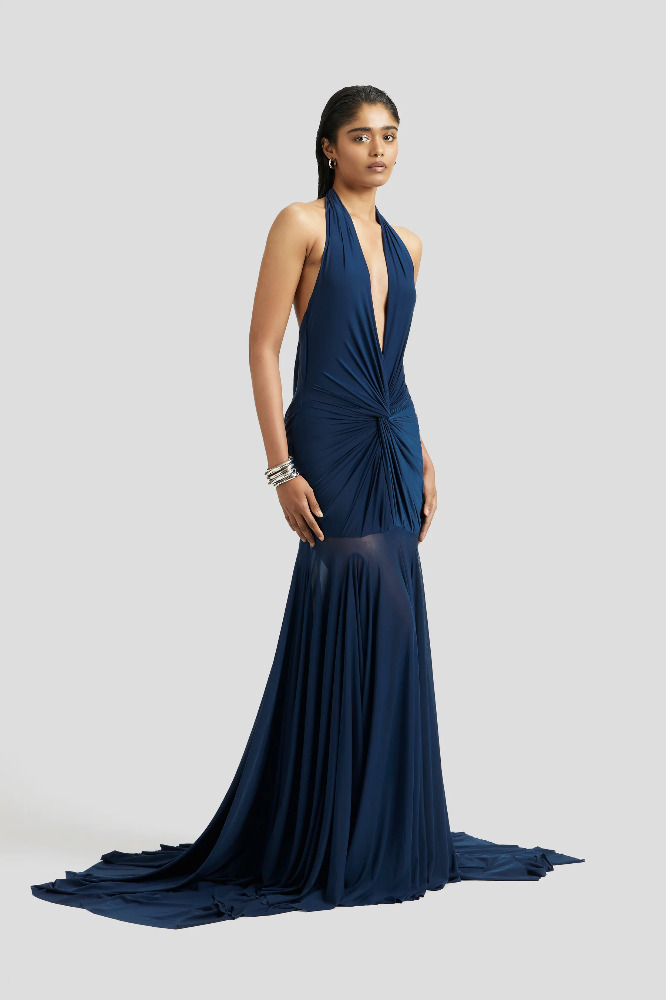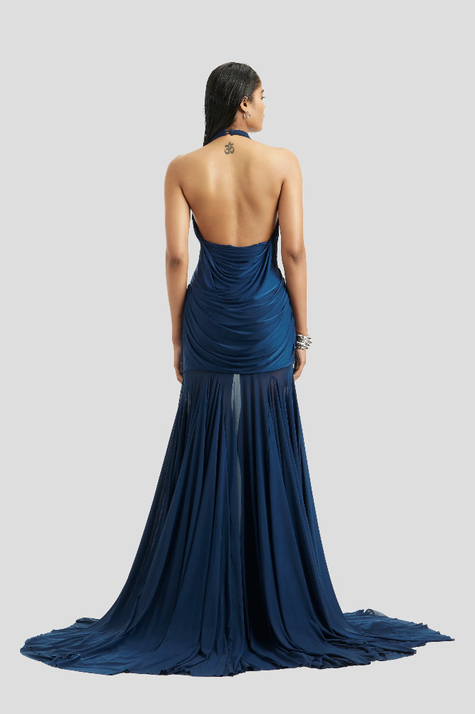 Indulge in the allure of sophistication with this malai lycra draped gown, adorned with flared mesh panels for a touch of whimsical charm. The twisted draped bodice defining the body from the front while the cowls defining elegance at the back. Flowing from the waist down, the flared mesh panels add movement and dimension, creating an enchanting aura as you glide across the room. This gown exudes timeless elegance and feminine grace, ensuring you stand out with effortless poise and style.