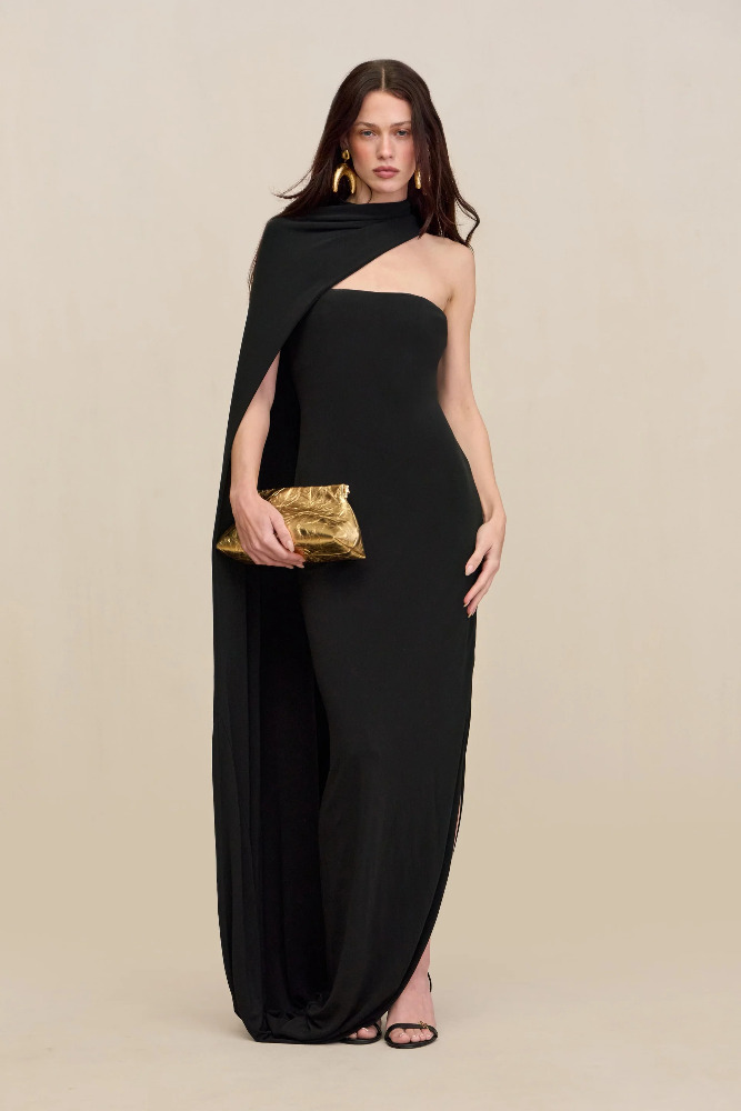 An elegantly draped gown with a strapless bodice and a full length skirt that doubles as a cape-like shawl.