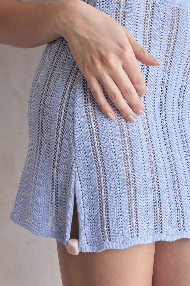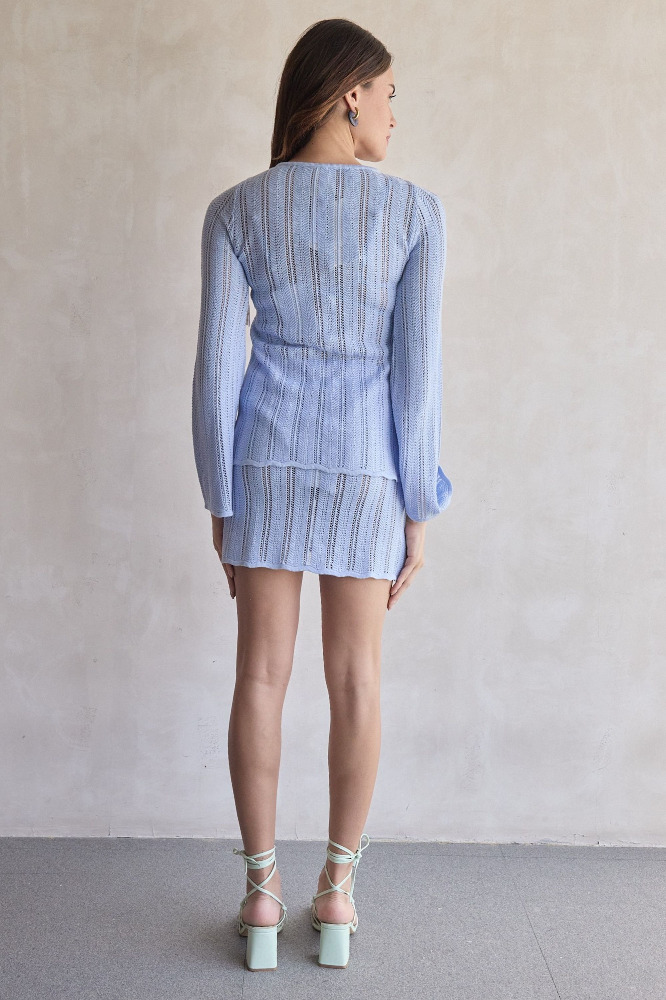 Introducing the "Corsica Top & Skirt " in Ciel – a top with a round neckline, sheer knit fabric, and front cutouts. Designed with a front slit and embellishments for added detail. Unlined for a lightweight feel. Pair with matching skirt for a coordinated look.