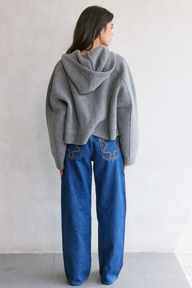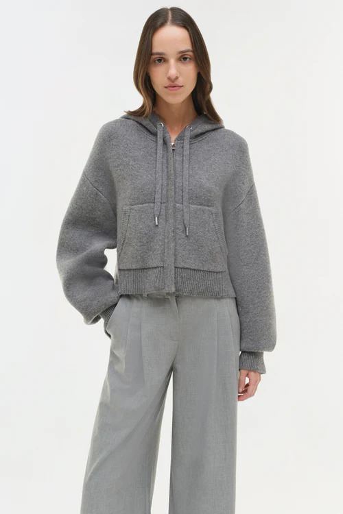 An updated zip-front hoodie sweater crafted from structured wool with a zip front closure, cropped hemline, and voluminous, elongated sleeves.