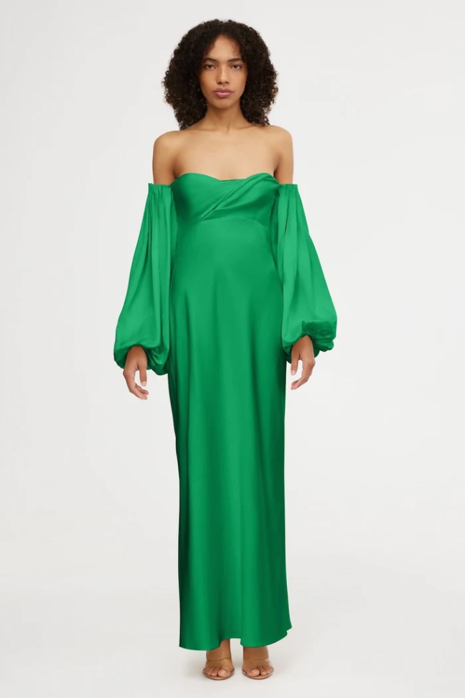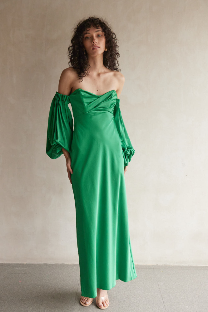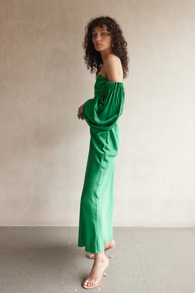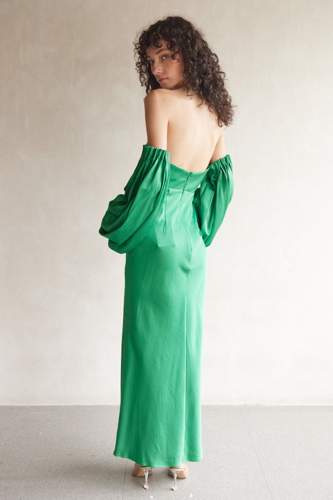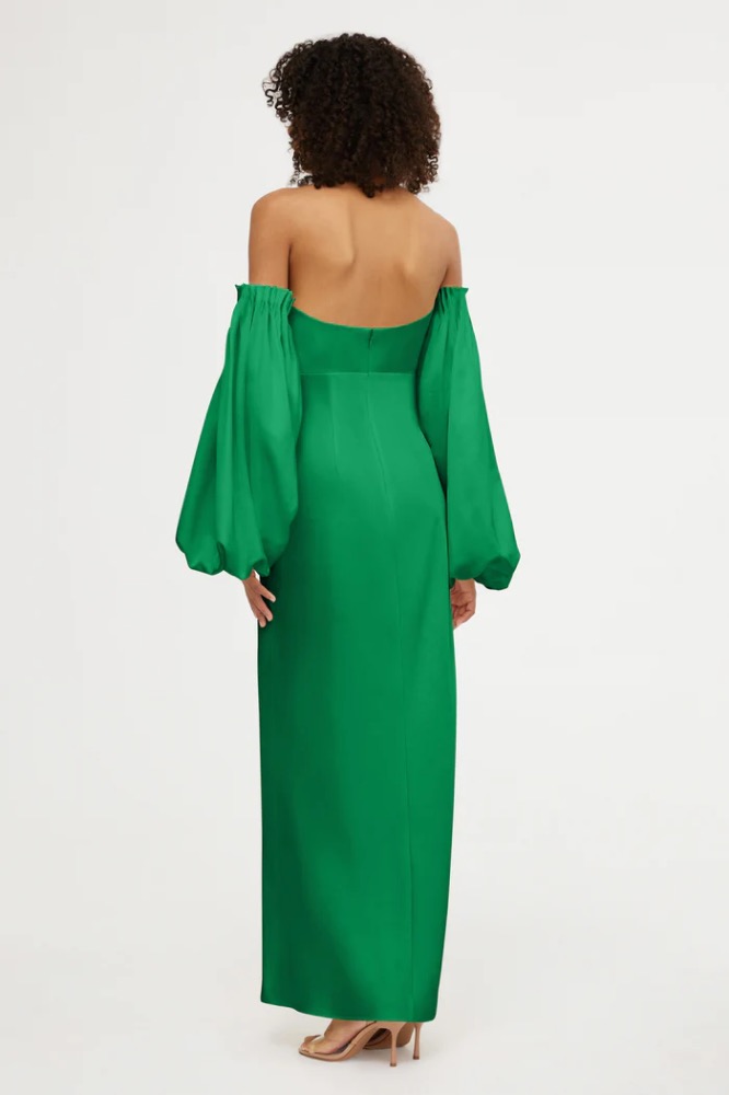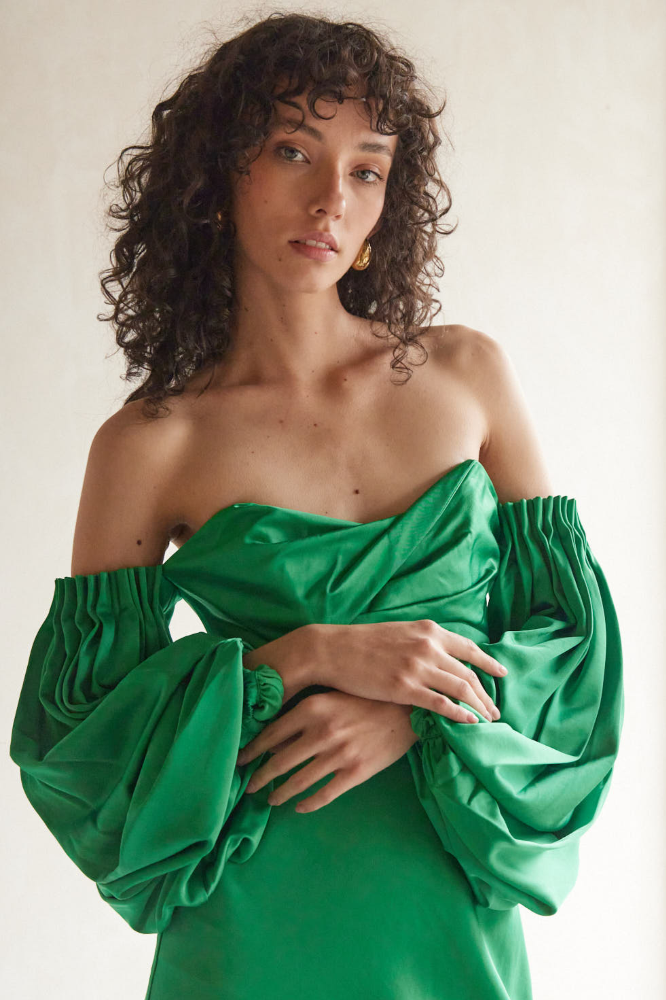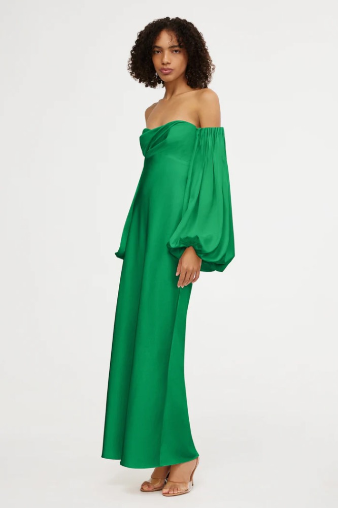 An elegant silhouette for your events this season ~ the Danika Off Shoulder Dress in Emerald is crafted from our luxe satin fabrication. Complimented with a twisted front bodice design, off shoulder sleeves with pleated detail and scooped backline. A great option for bridesmaids.