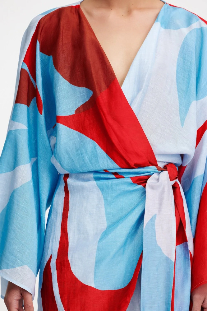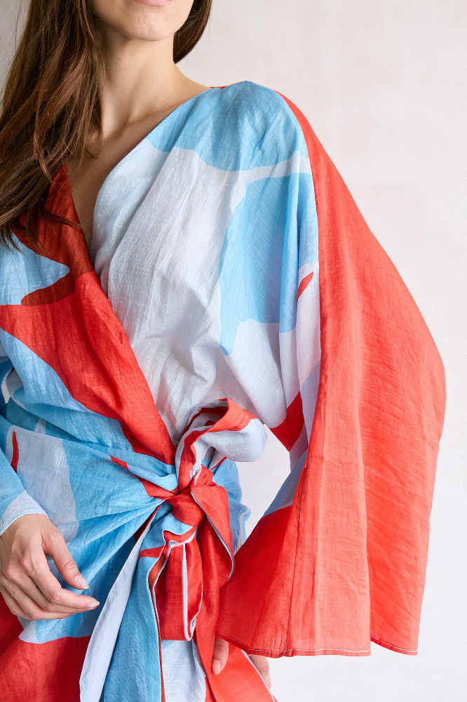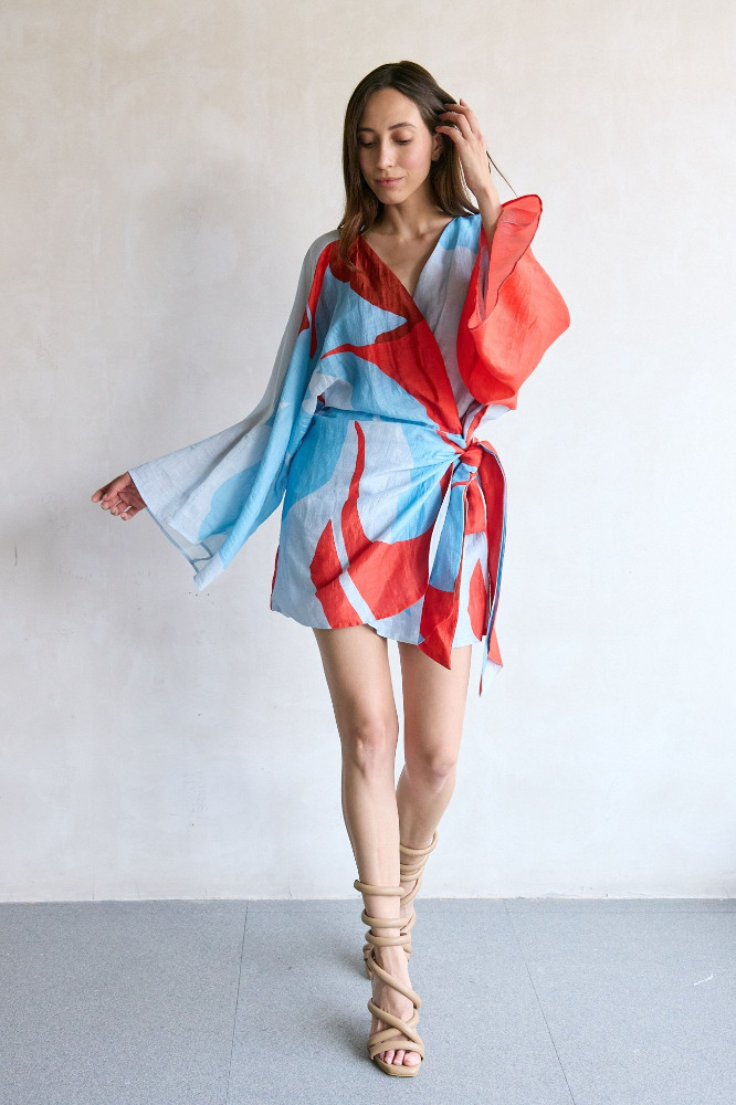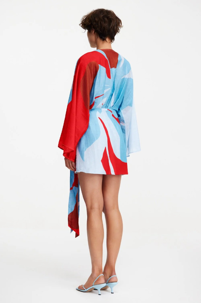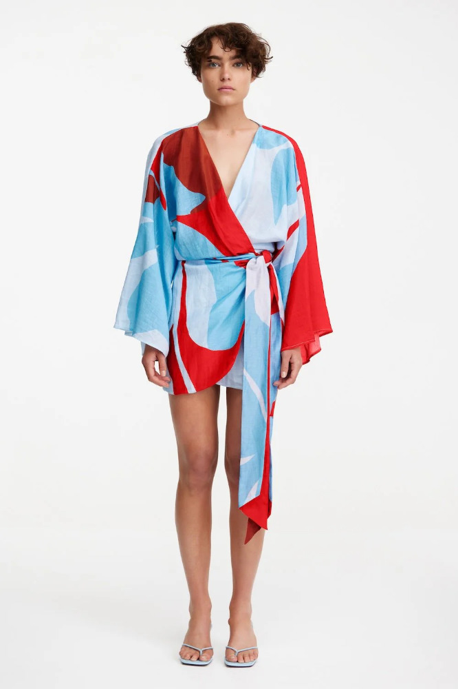 The Edith Mini Dress in Crimson Stencil is bold, easy, and effortlessly chic. Made from a woven fabric featuring a striking placement print, this wrap-style mini dress is both versatile and stylish. Full sleeves and tuck-and-drape details add volume and elegance, while the front and internal tie closures ensure a flattering fit. Lined through the skirt for added comfort, it's the perfect statement piece for confident, carefree dressing.