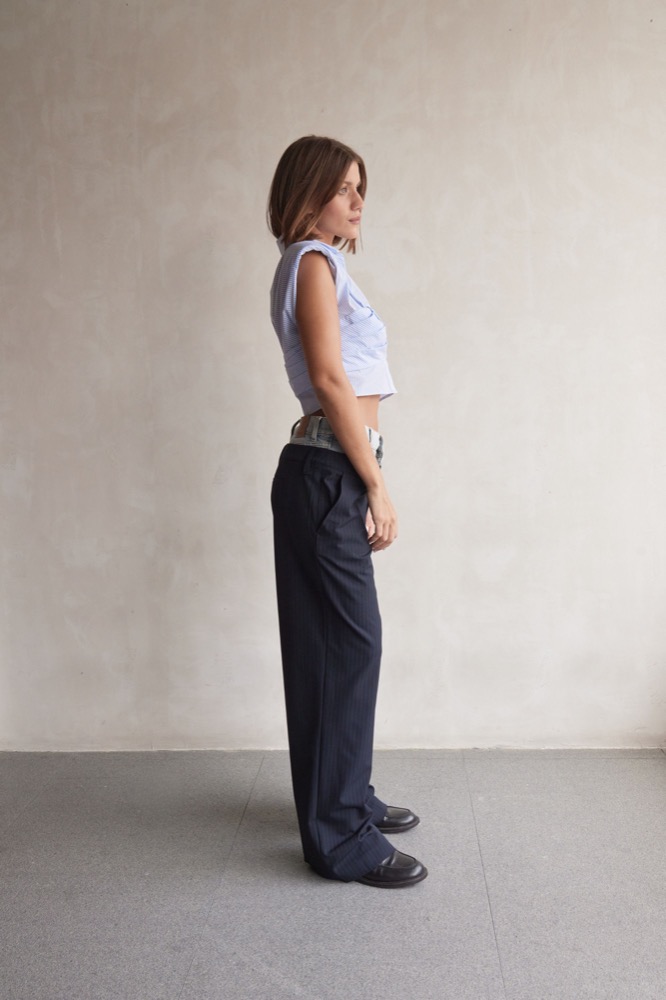 This cropped top features structured, boxy sleeves that add a unique architectural element to its silhouette. The crisp collar and clean lines are complemented by a subtle texture, enhancing its modern appeal.