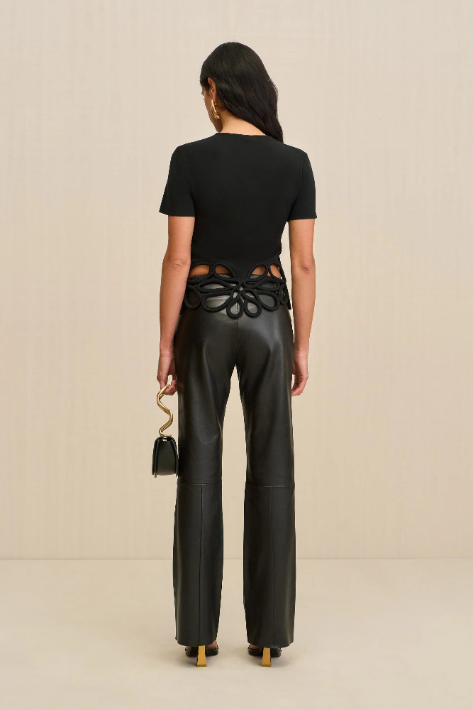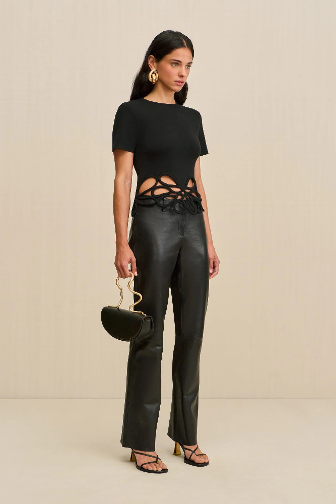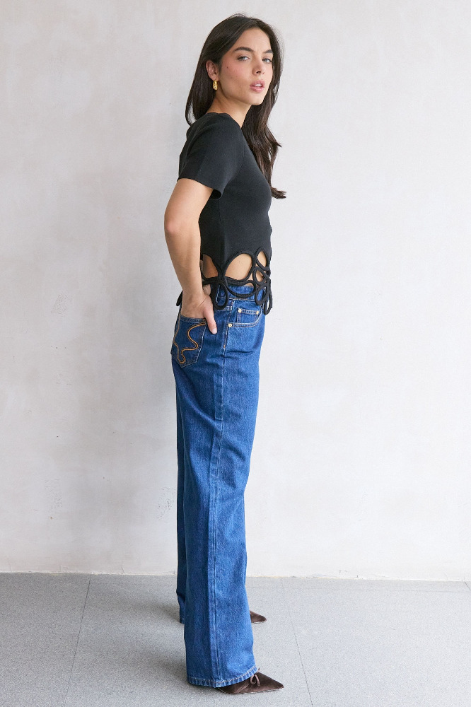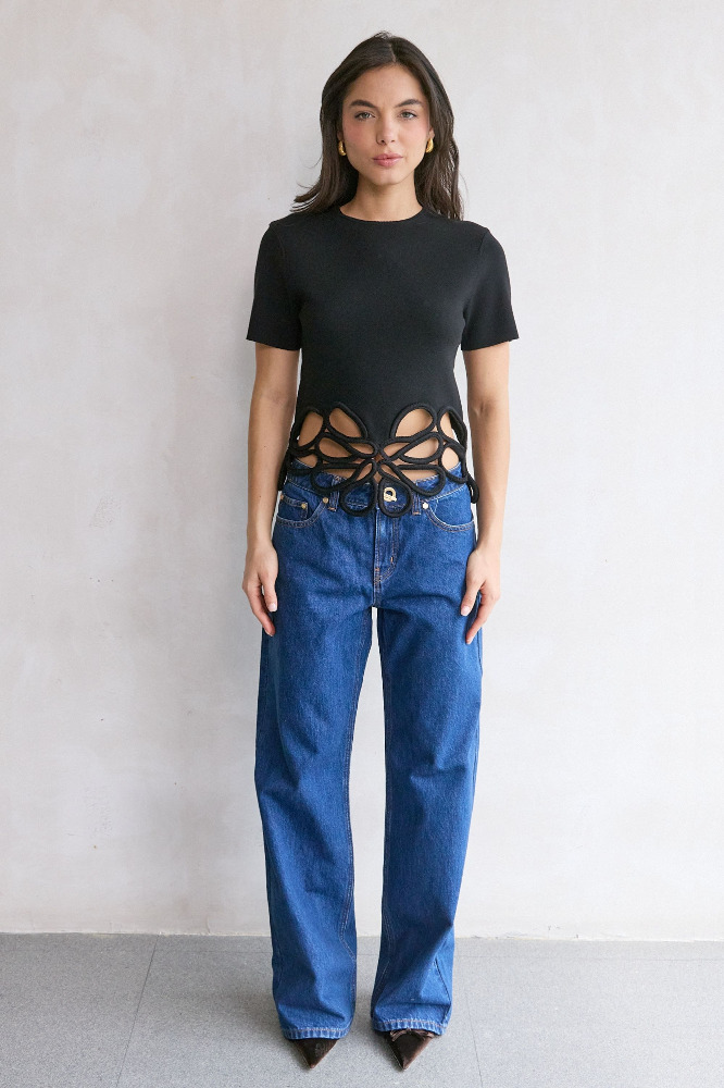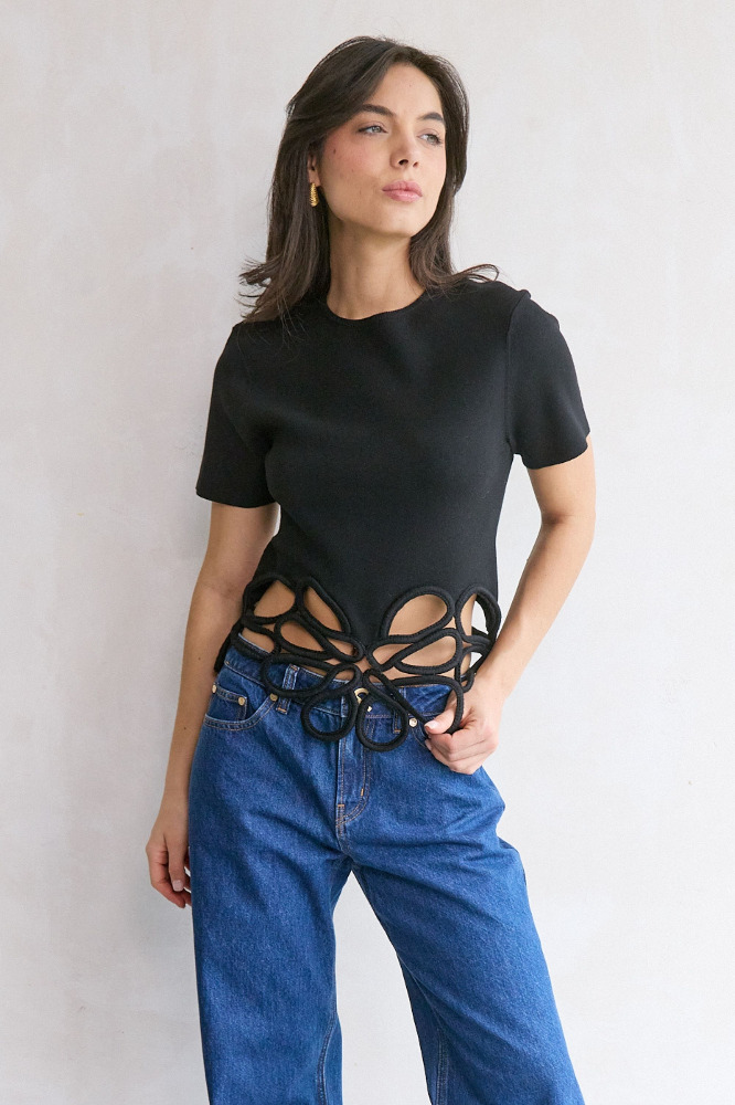 A short sleeve knit top featuring an eye catching corded crochet detail at the hem.