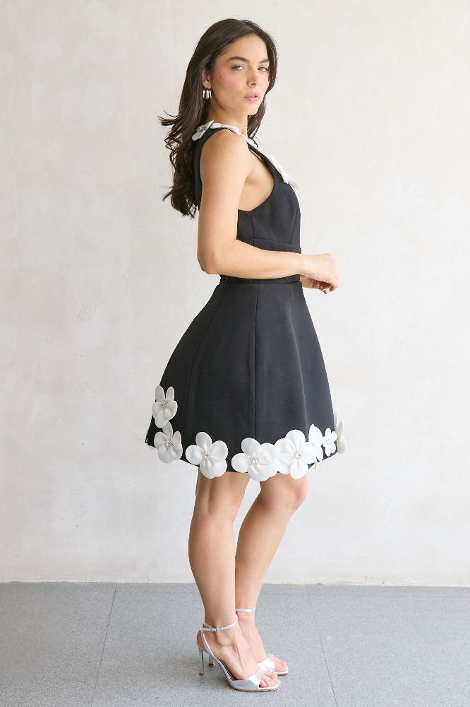 Refined and romantic, the Estelle Mini Dress features a flattering V-neckline and delicate floral appliqué that adds an elevated touch. The perfect balance of elegance and femininity.