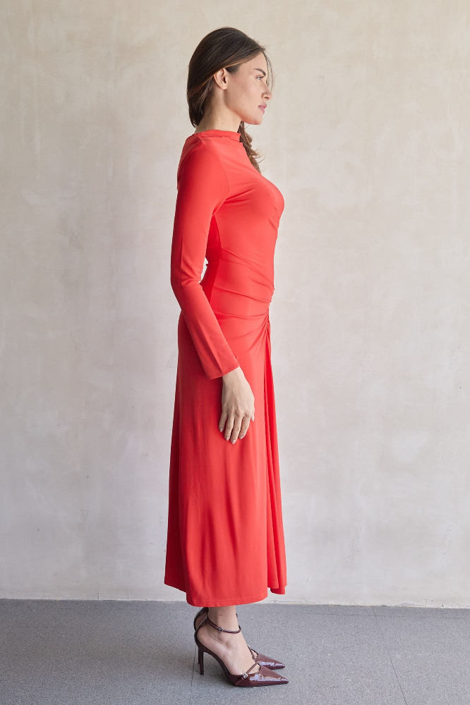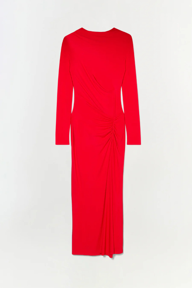 This long-sleeve midi in draped jersey features an artful, figure-flattering silhouette, embodying understated elegance with a modern twist.