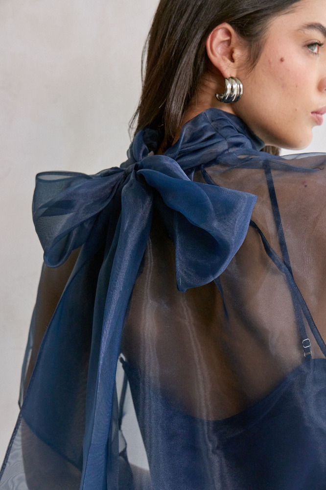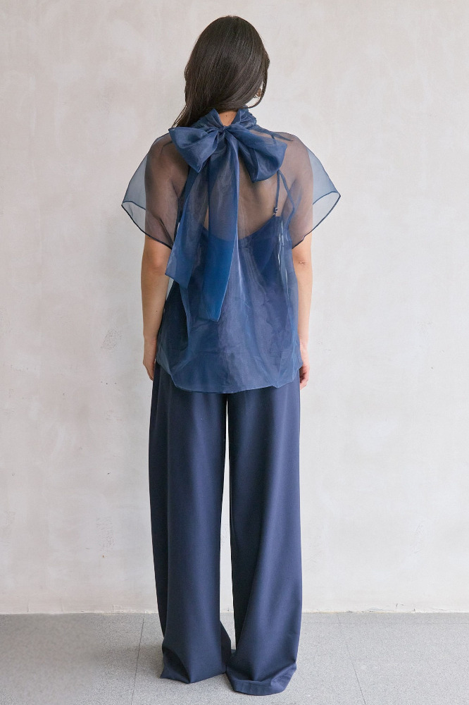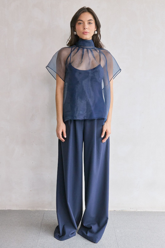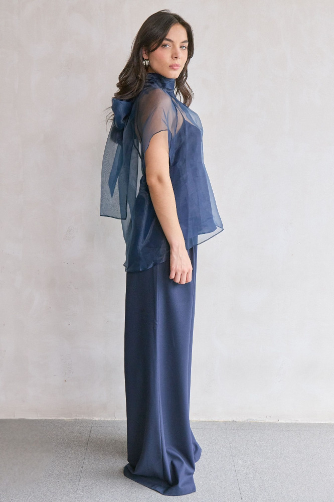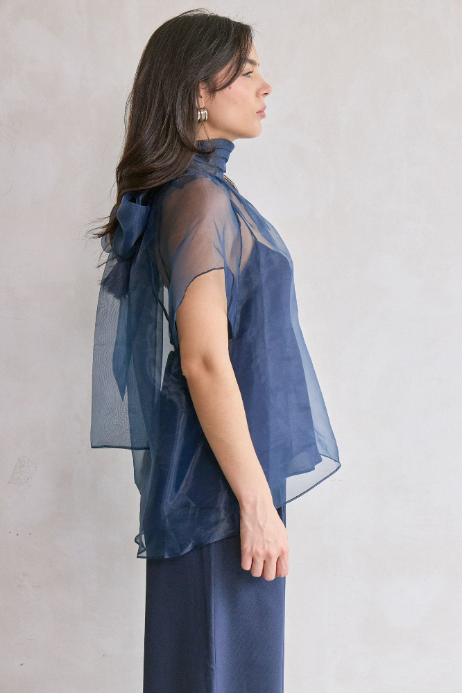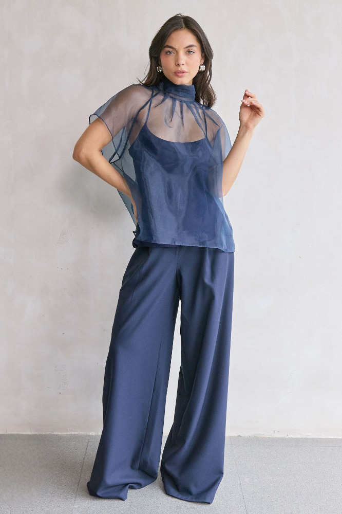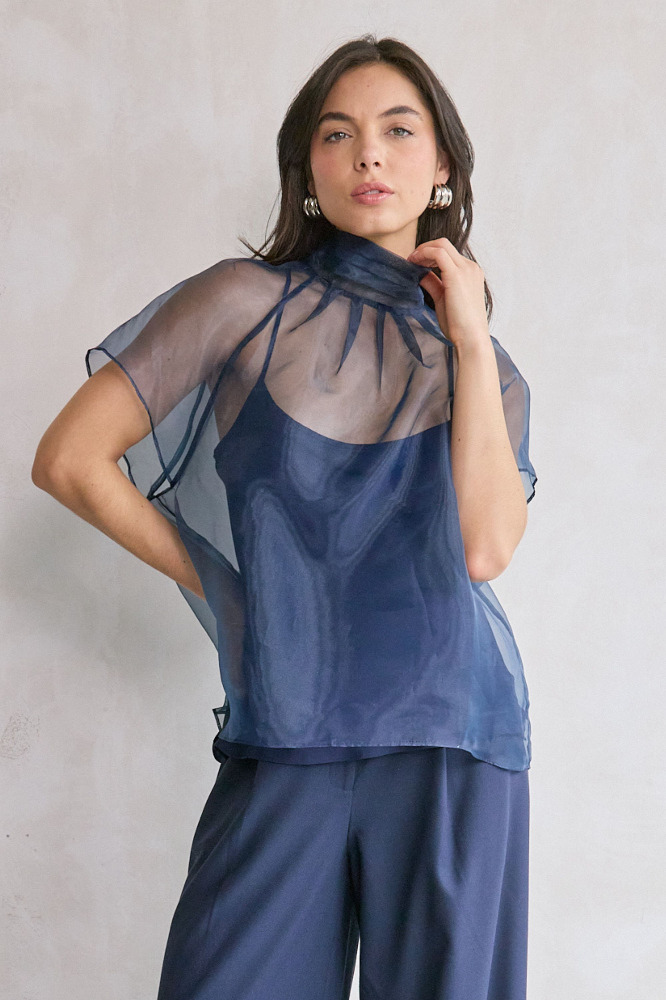The Feyre Top . This short-sleeve piece showcases a clean silhouette with a sheer overlay for added texture and visual interest.