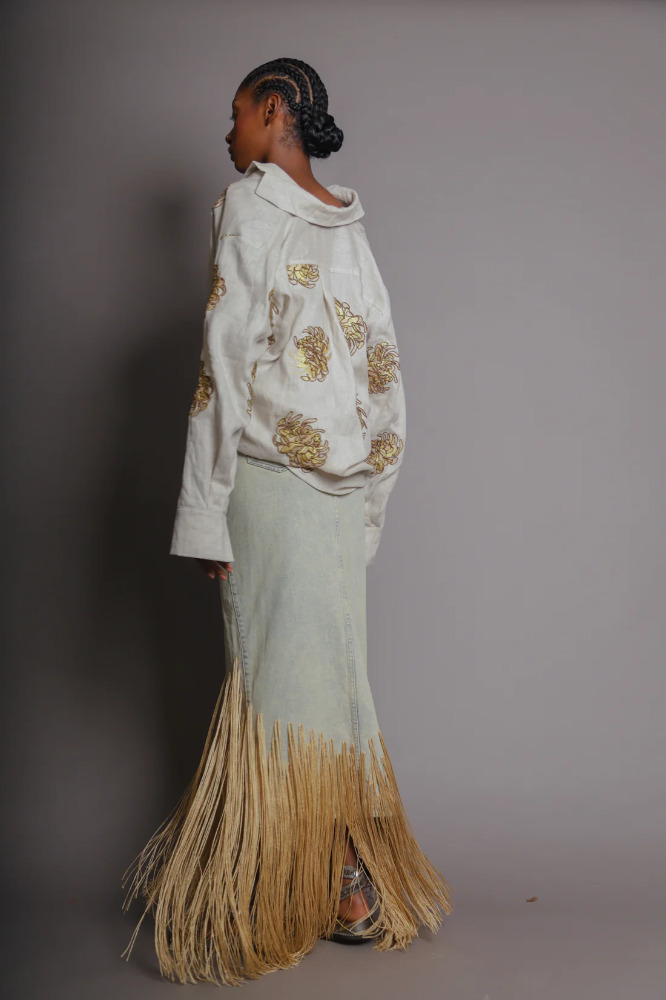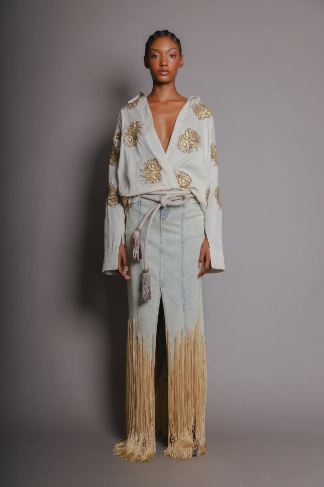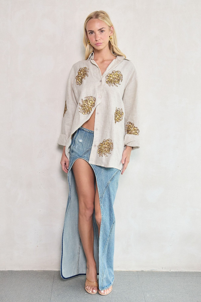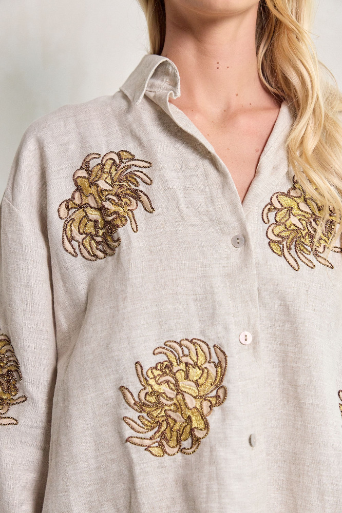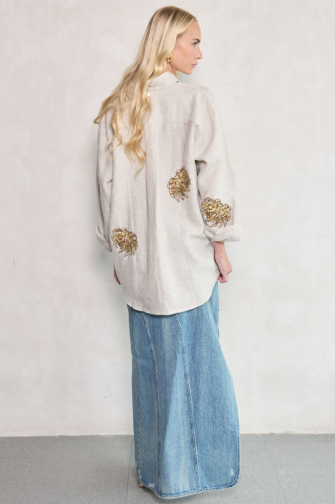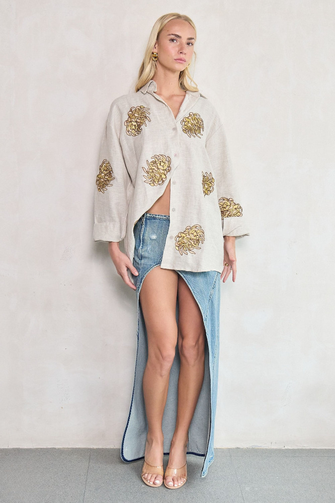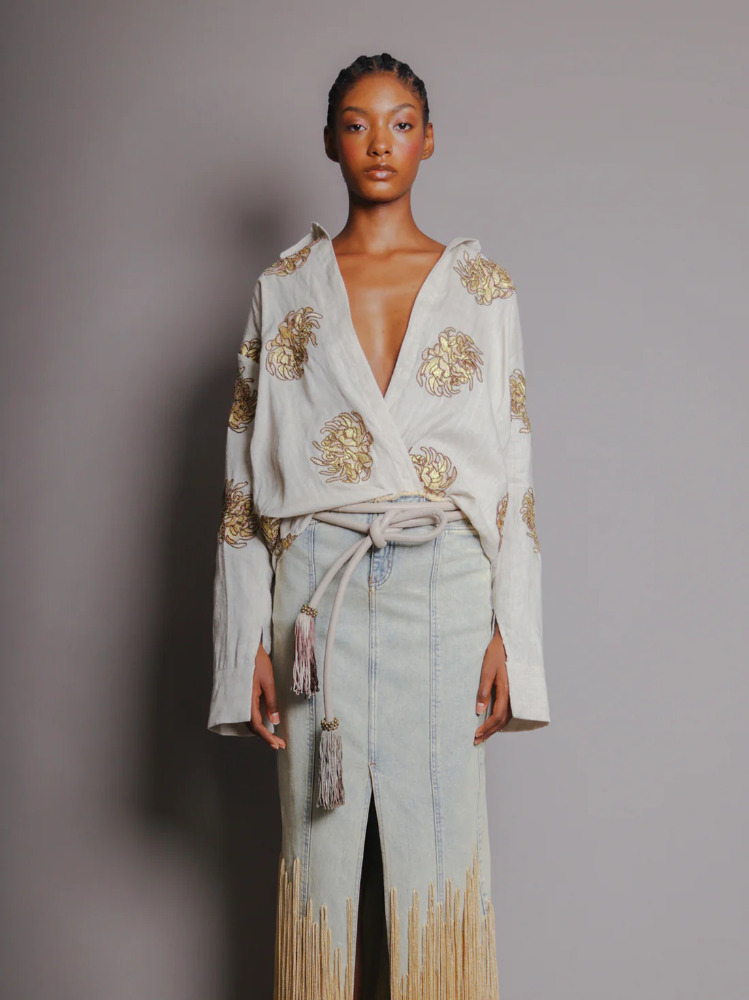 A piece that blooms with bold elegance. This white linen wrap shirt features artisanal golden chrysanthemum embroidery, capturing the ethereal spirit of the EDÉN collection. The relaxed fit, wide collar, and long sleeves create a refined silhouette that elevates any outfit with a luxurious boho touch.