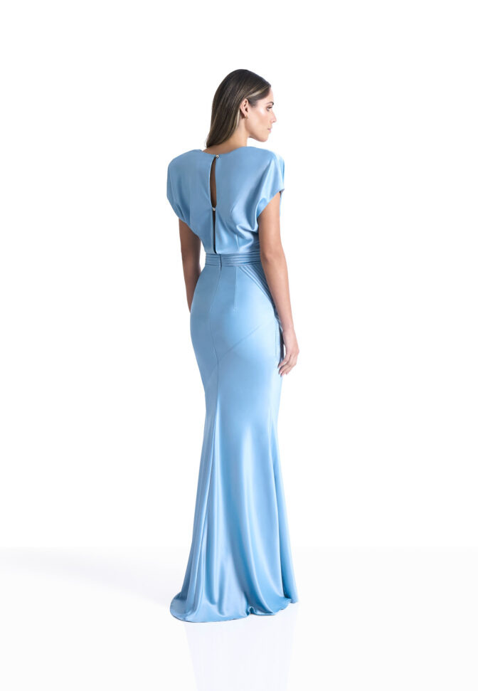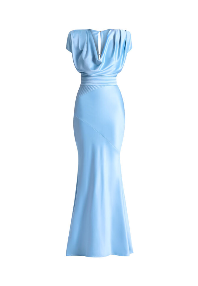 A SATIN BIAS CUT GOWN WITH DRAPED NECKLINE, STITCHED SATIN WAIST AND NATURAL SHOULDERS