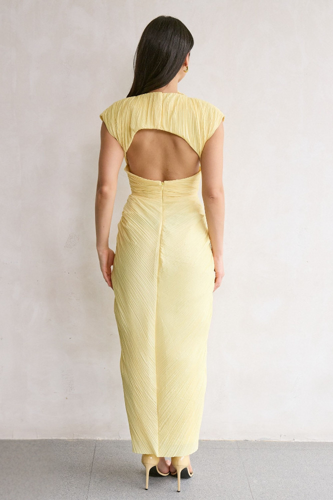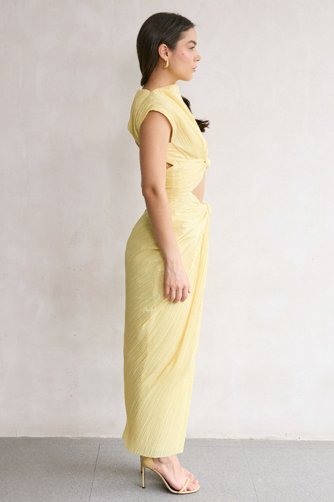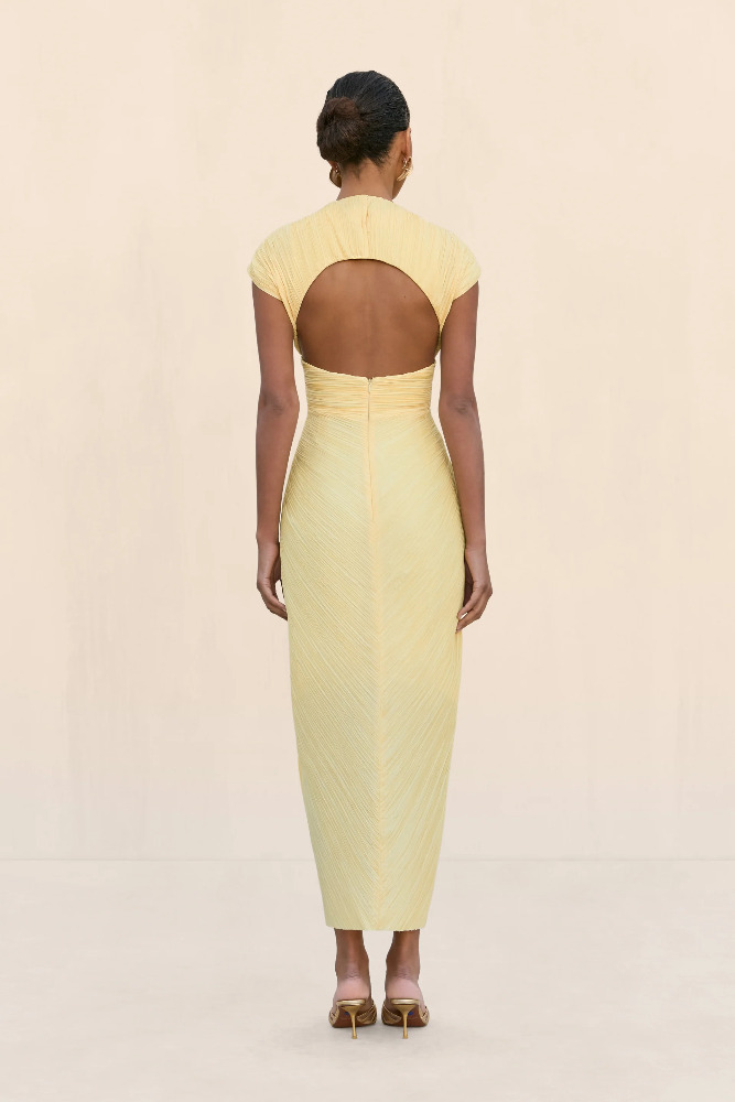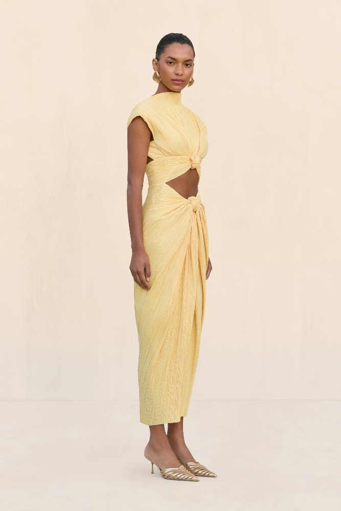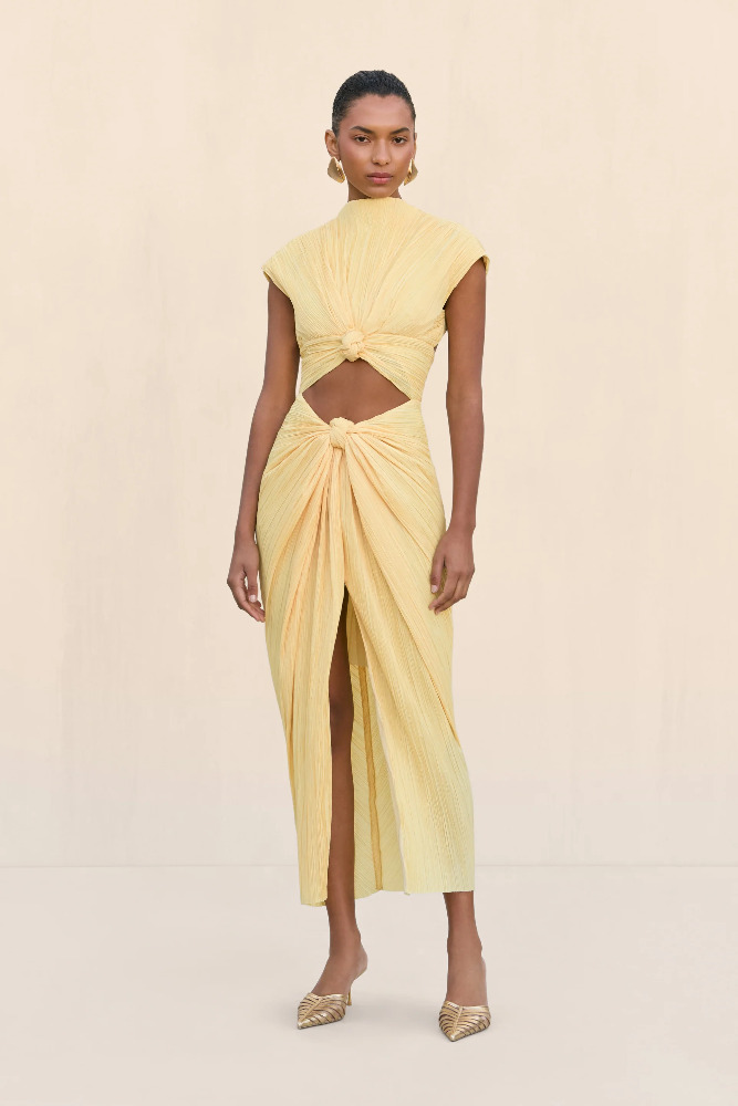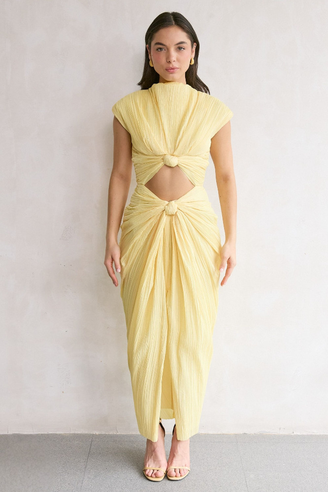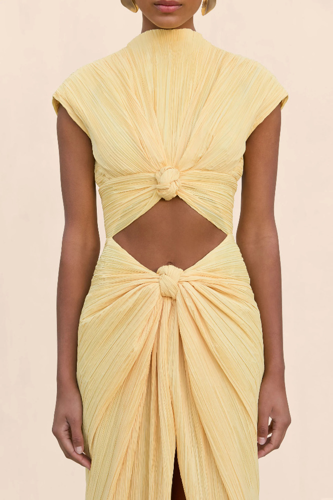 A plisse midi dress featuring a flattering chest cutout and a mock neckline.
