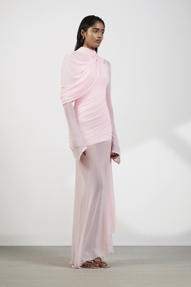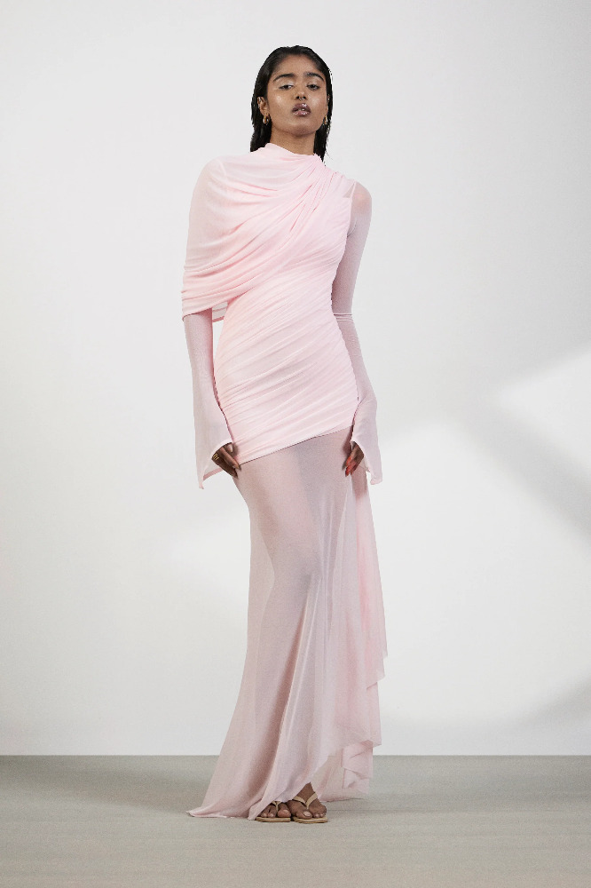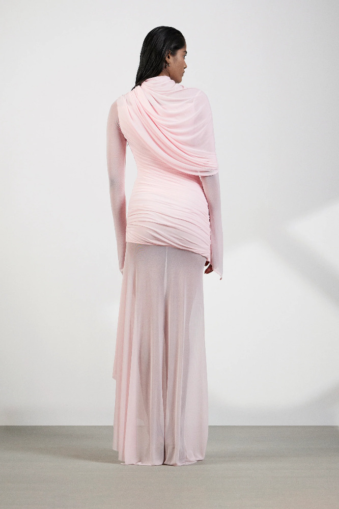 Ethereal and sensual, this baby pink ensemble blends soft structure with delicate transparency. Crafted in luxurious Malai and Net, the body features artful drapes, long sleeves and meticulous ruching that contour the silhouette with elegance. The net skirt flows freely, revealing just enough through its sheer fabric and asymmetrical hemline for a subtle yet striking effect.