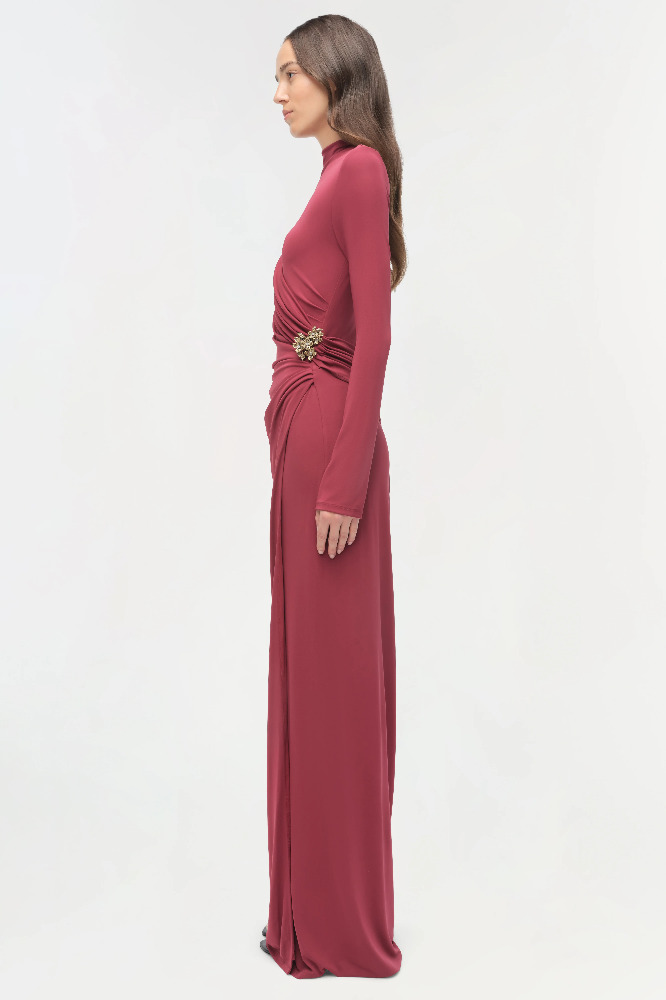 A full length dress in fluid jersey that is artfully gathered and accentuated with embellished hardware to flatter the form. High neckline, long sleeves, side slit.