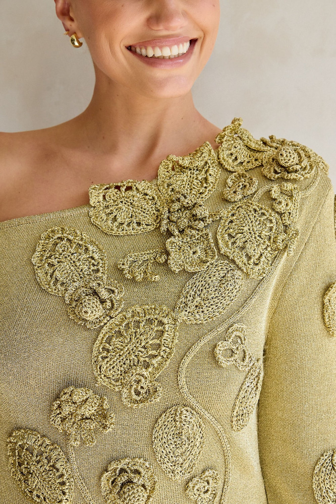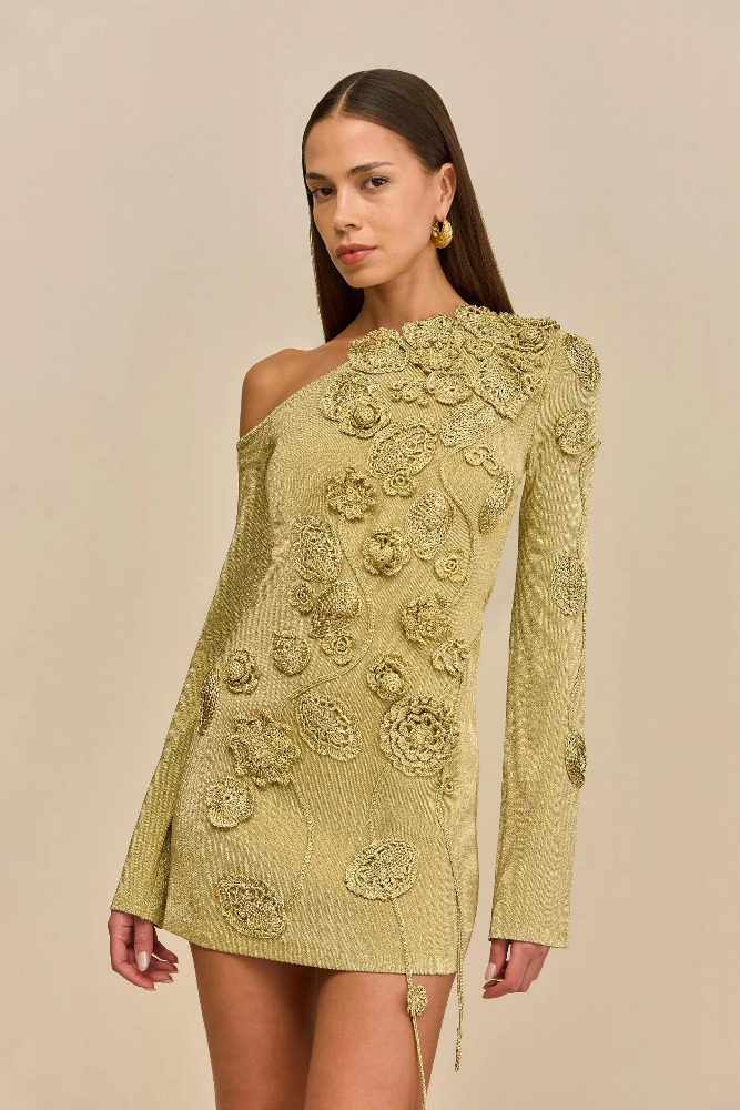 A hand-crocheted metallic knit mini dress with an off-the-shoulder silhouette.