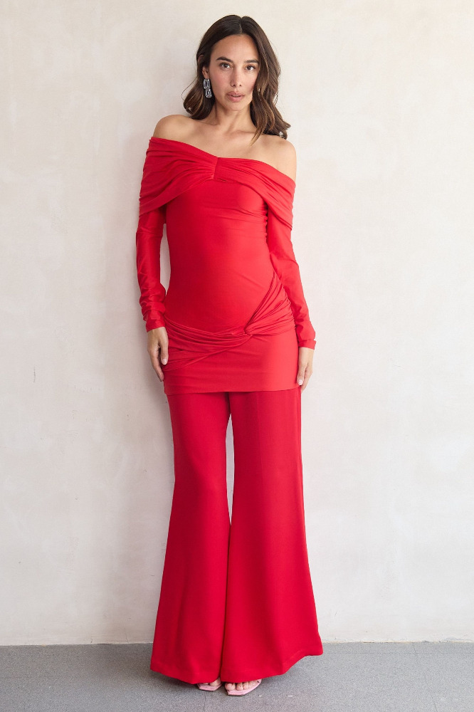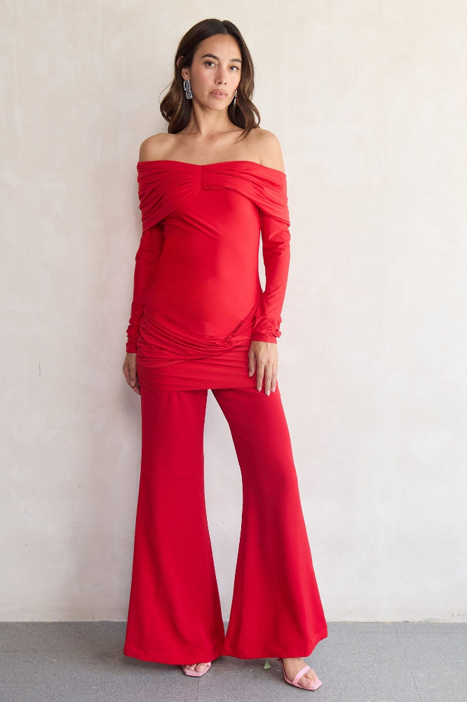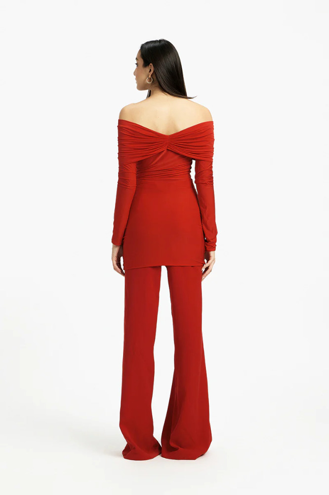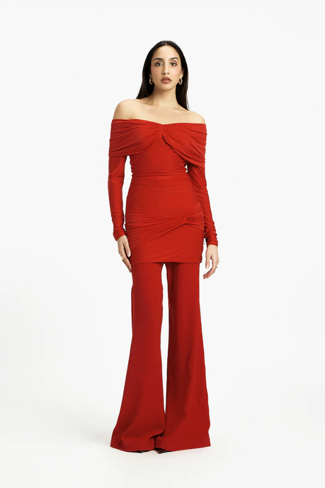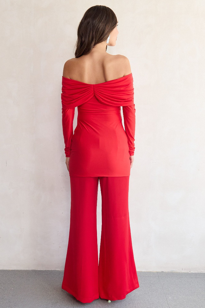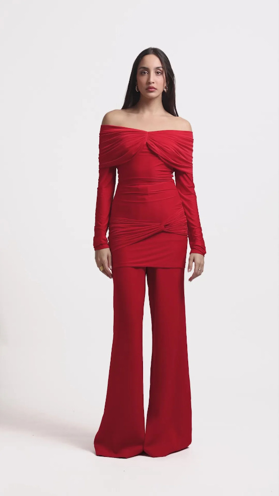The top showcases a ruched center detail across the bust and waist, creating a flattering and feminine silhouette. Paired with straight pants, this ensemble effortlessly combines style and comfort. Ideal for both casual outings and semi-formal events, the unique design of the top adds a touch of sophistication, while the straight pants ensure a polished, streamlined look.