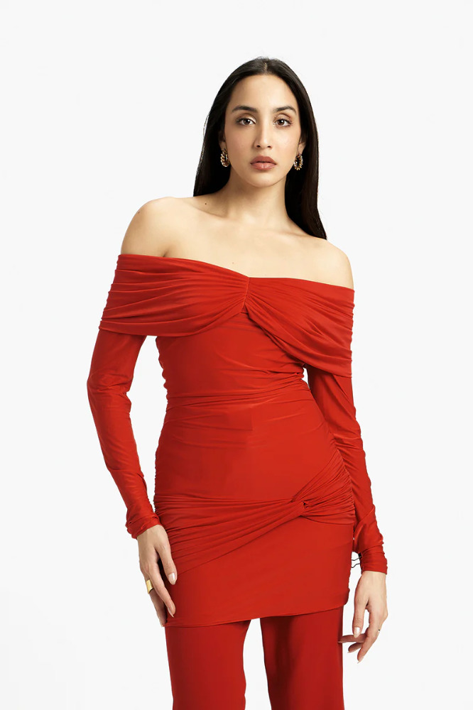 The dress features full sleeves and heavy ruching across the hips and waist, creating a flattering silhouette. The draped detail adds a touch of sophistication, while three gold brooches on the side of the ruched area provide a luxurious accent. Ideal for both formal and semi-formal occasions, this dress ensures you stand out with its unique and stylish design.