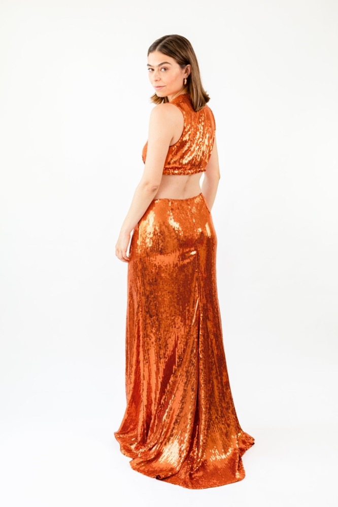 Le Marais is our 2nd design. It's a dress with cuts at the top, made of stretch fabric covered in sequins, with a skirt and train. This dress is very long, perfect for tall individuals.