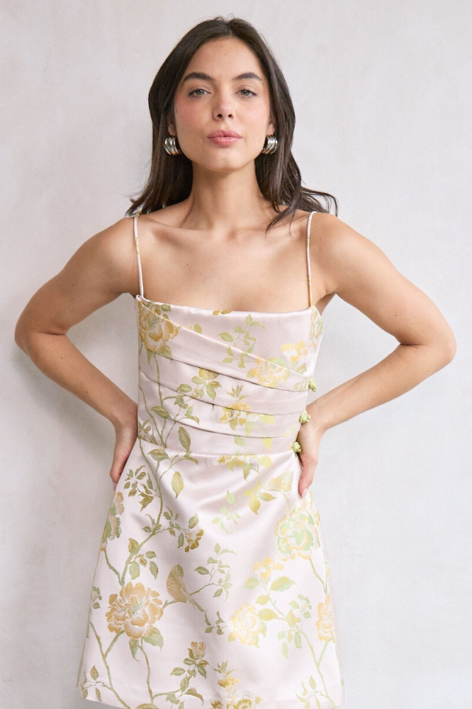 Brocade strap mini dress with fully-boned pleated bust and A-line fit skirt.