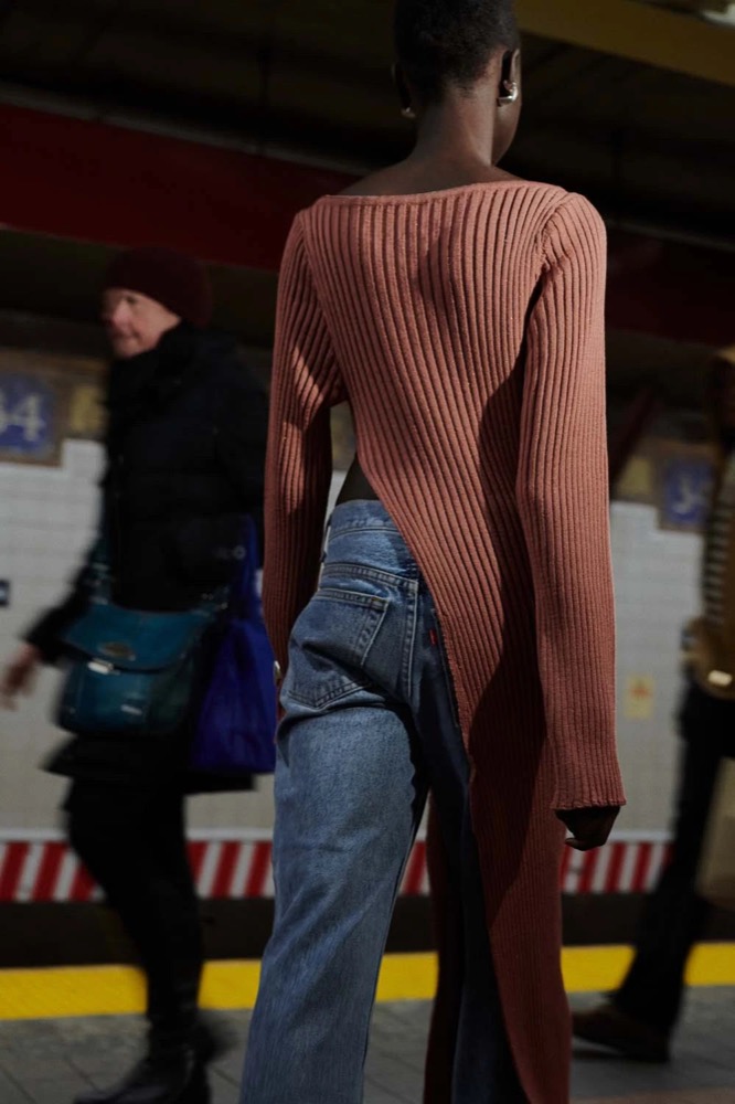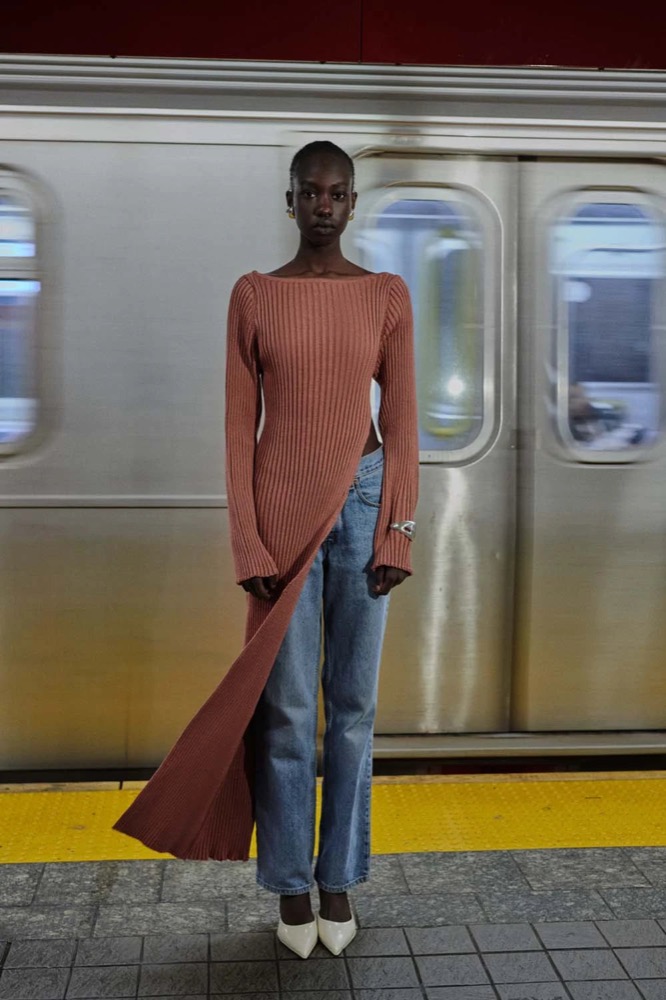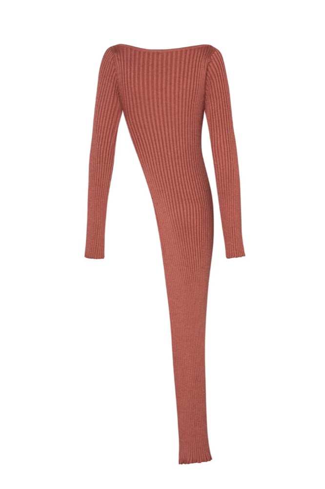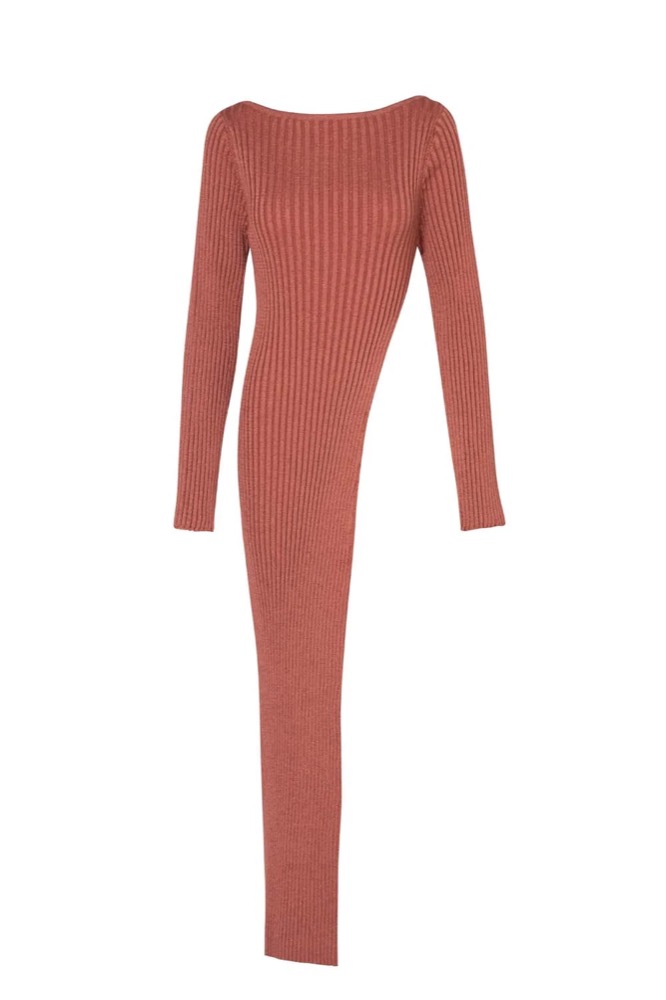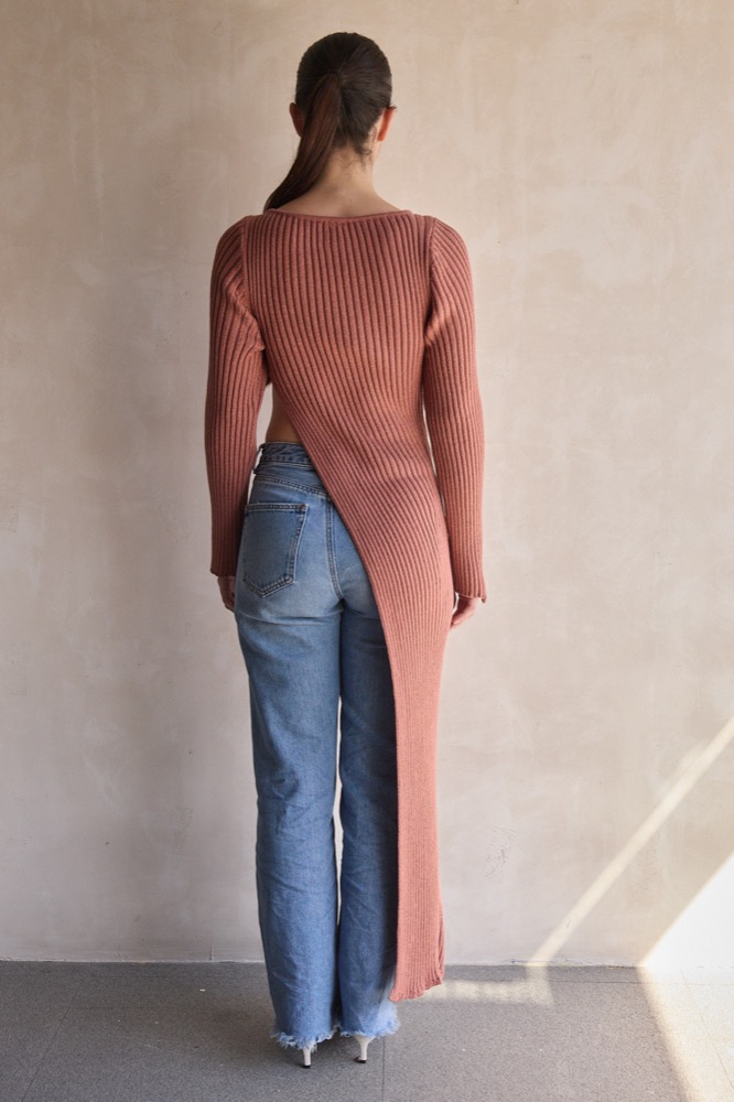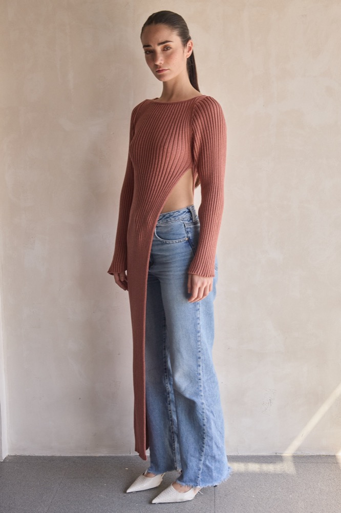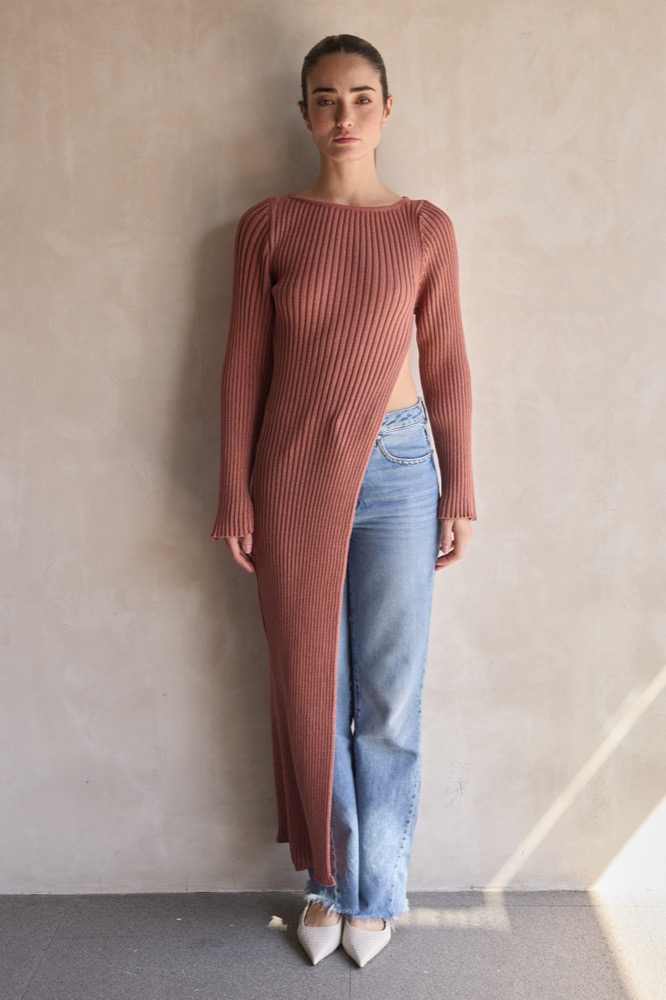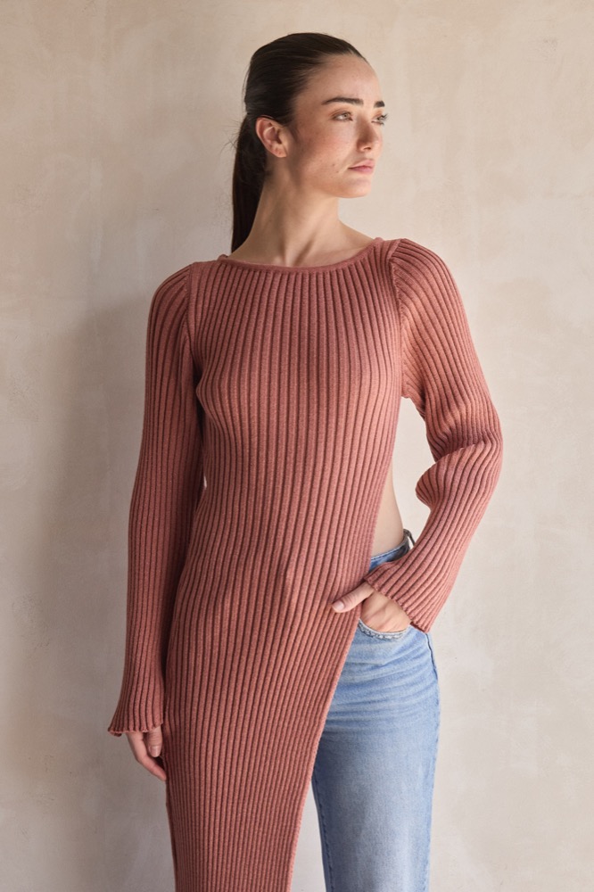 "Masaki Top" in Aperol – this long-sleeved, ribbed top features a round neckline and a side slit that extends from the waist to the ankle. Its rich color and sleek design offer both comfort and style, making it a versatile addition to any wardrobe.