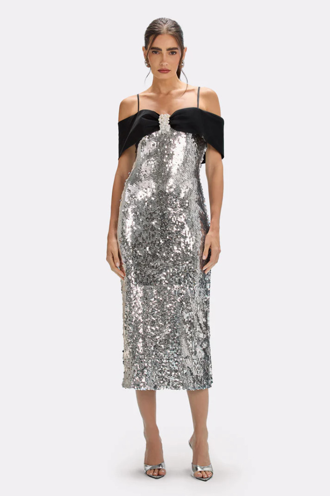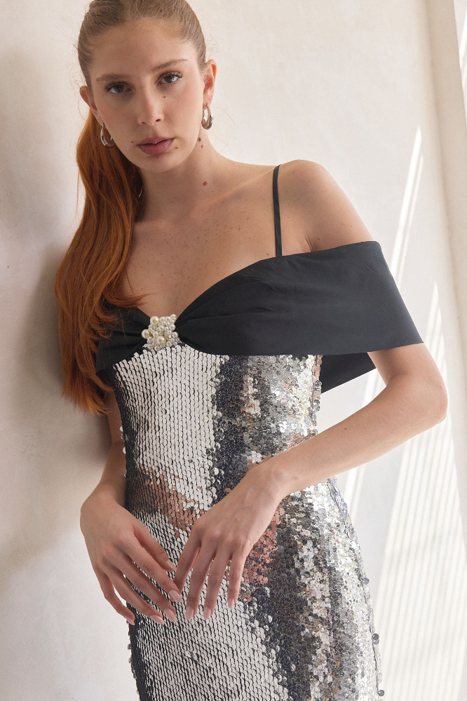 This midi dress blends classic glamour with a modern twist. Fully adorned in shimmering silver sequins, it features a black satin bust overlay that contrasts beautifully with the sparkle beneath. The off-the-shoulder neckline is complemented by delicate shoulder straps for added support, and a pearl brooch at the center of the bust adds a refined, vintage-inspired touch.