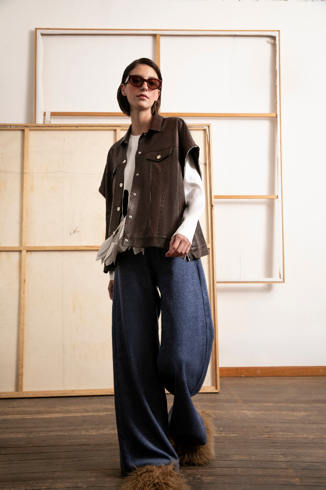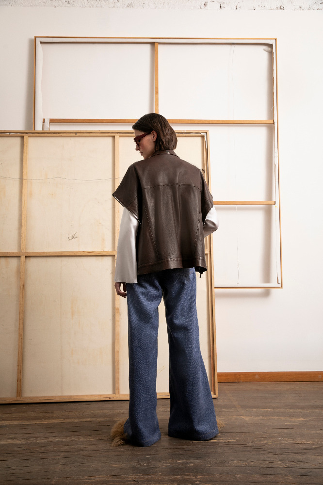 Brown lamb skin leather Green leather details poliester lining Silver zippers