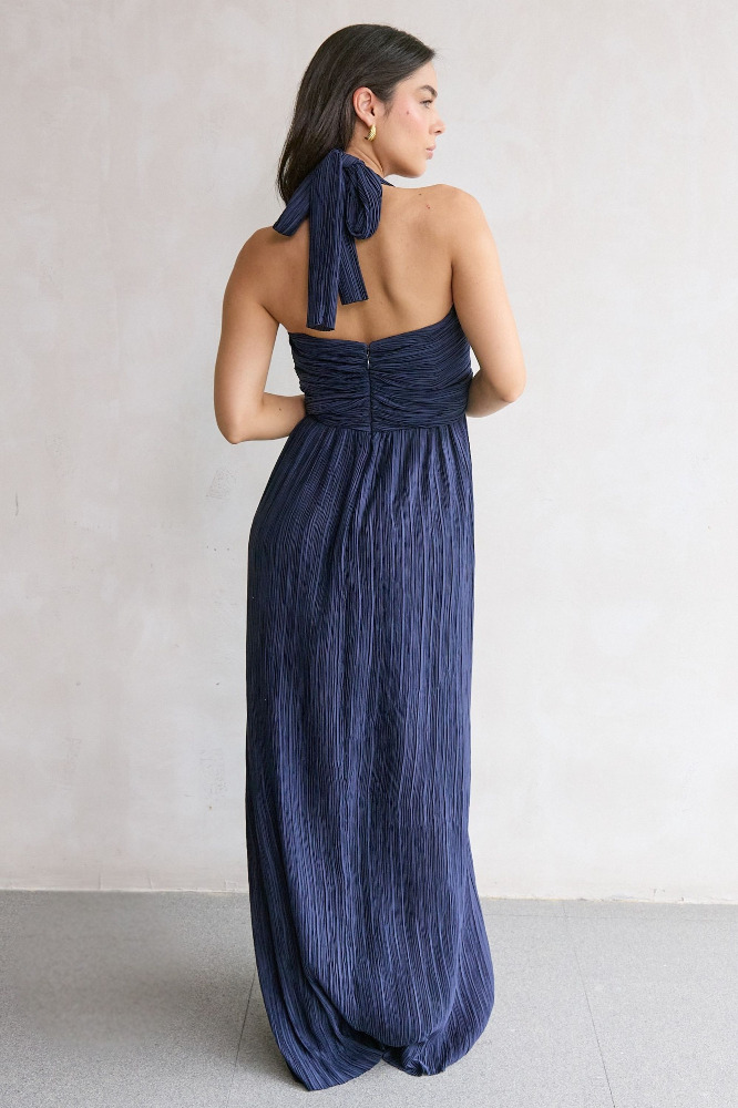 A breathtaking goddess gown crafted out of origami plisse, featuring a halter neckline and ring detail hardware adorning the chest.