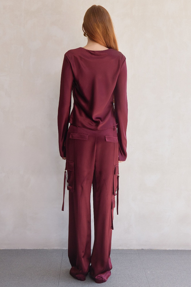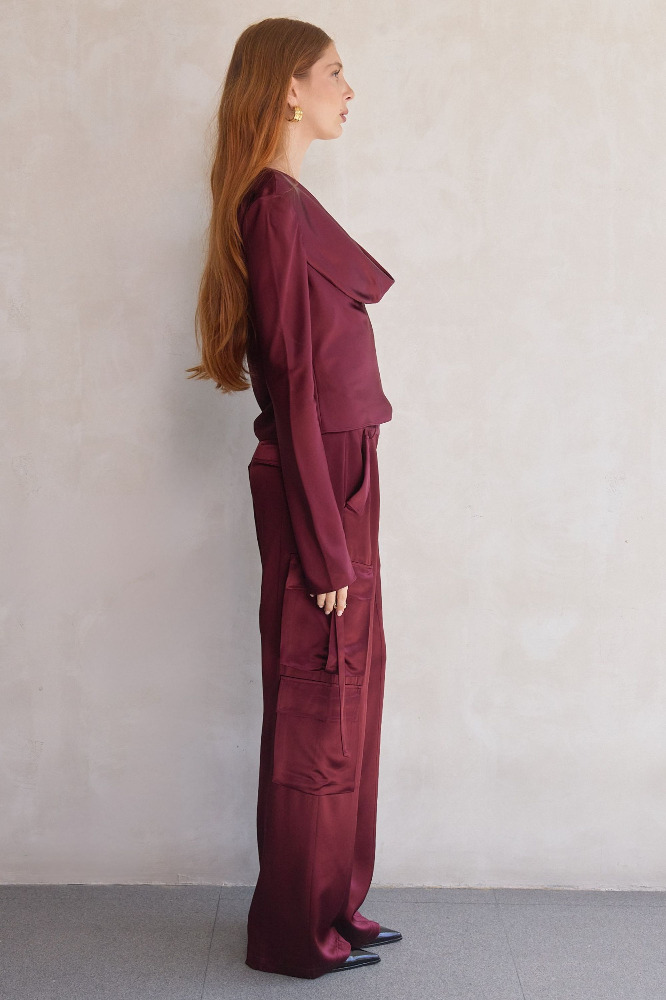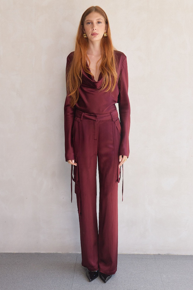 The André Pant is a glamorous twist to the on-trend cargo pant. Our version features the utilitarian details—side pockets and a wide leg—reimagined in a silky fabrication, perfect for going out. Pair it with our Nerissa Top for the ultimate co-ord look. Shown here in Port.