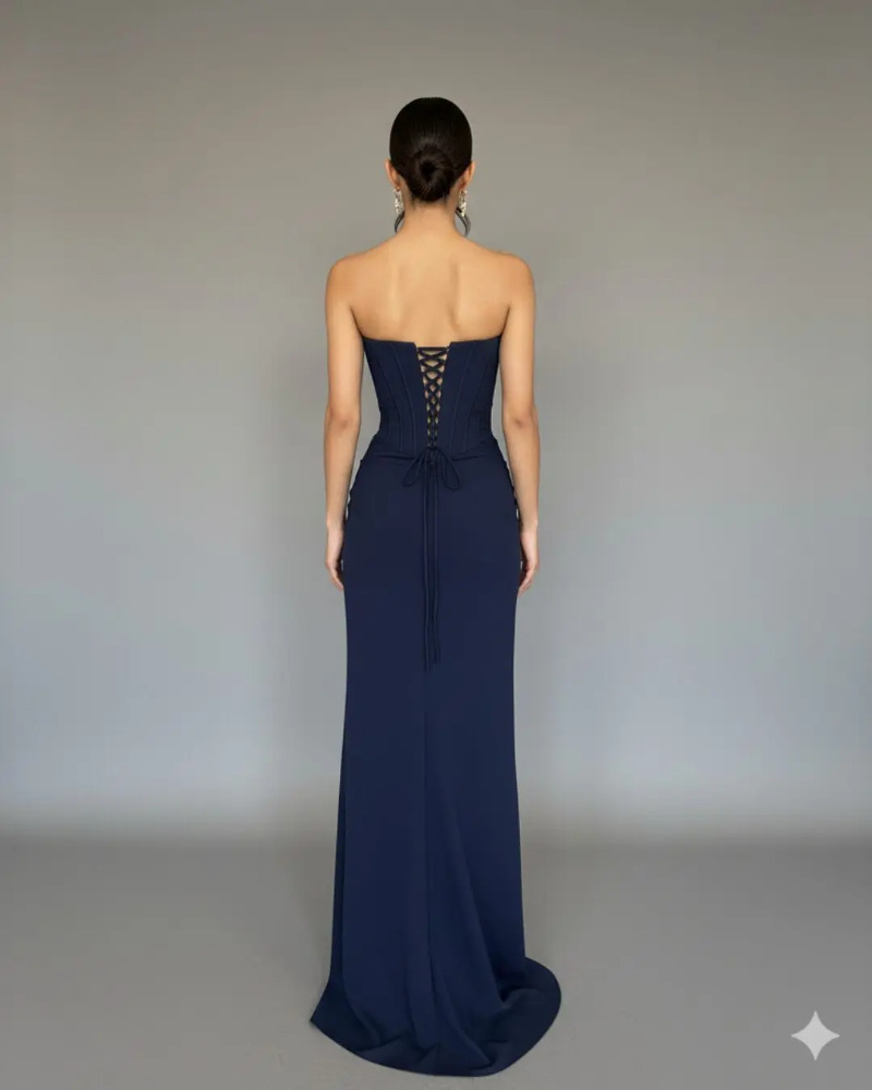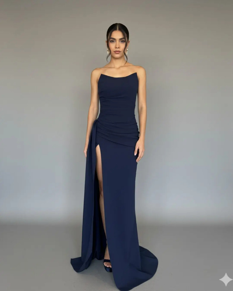 El Nesta Dress es un vestido strapless en azul marino intenso. El diseño presenta un fruncido lateral chic que acentúa la figura y una atrevida abertura alta para mostrar la pierna, asegurando una entrada glamurosa.