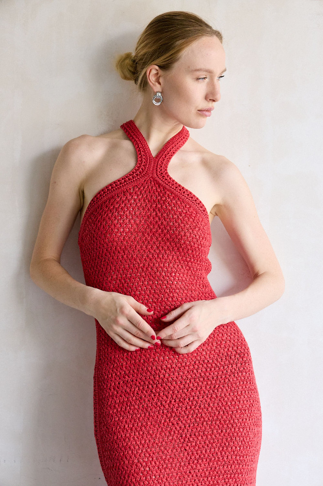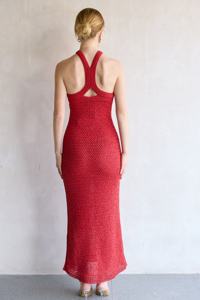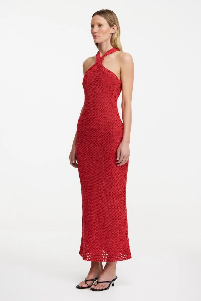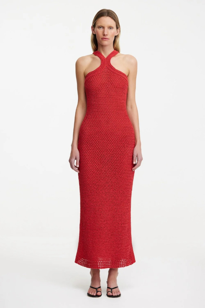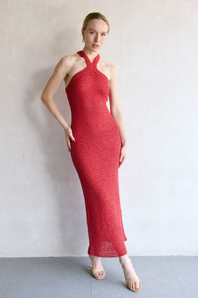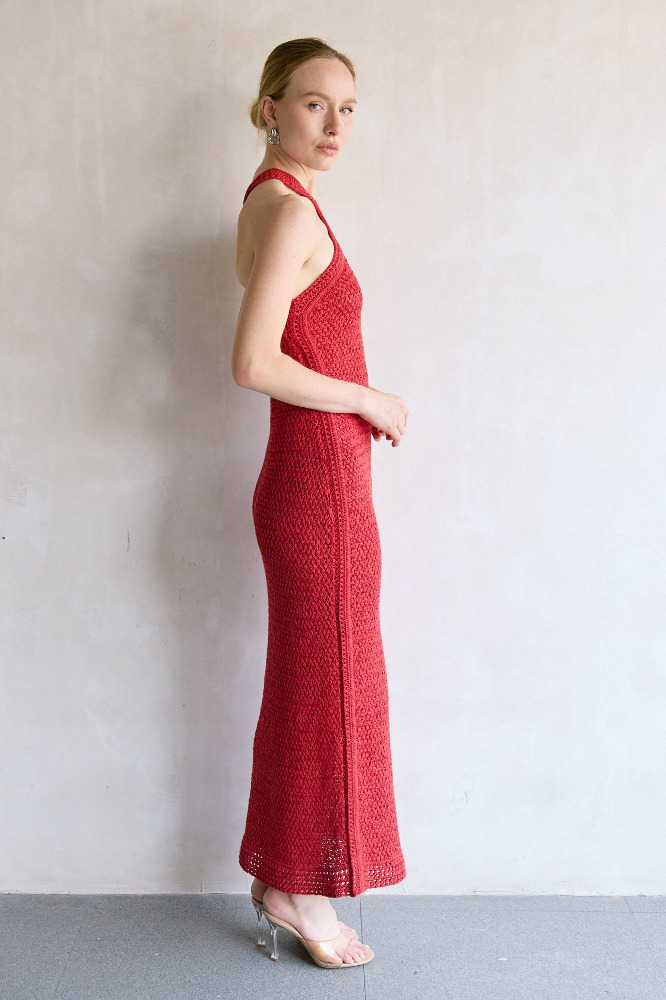 The Oakleigh Midi Dress in Chilli combines bold design with effortless elegance. Crafted from semi-sheer tape yarn knit, this unlined dress features an open weave detail at the hem band for added texture. Contrasting stitch lines at the straps, neck and side seams highlight its unique construction, making it a striking yet versatile piece for warm-weather styling.