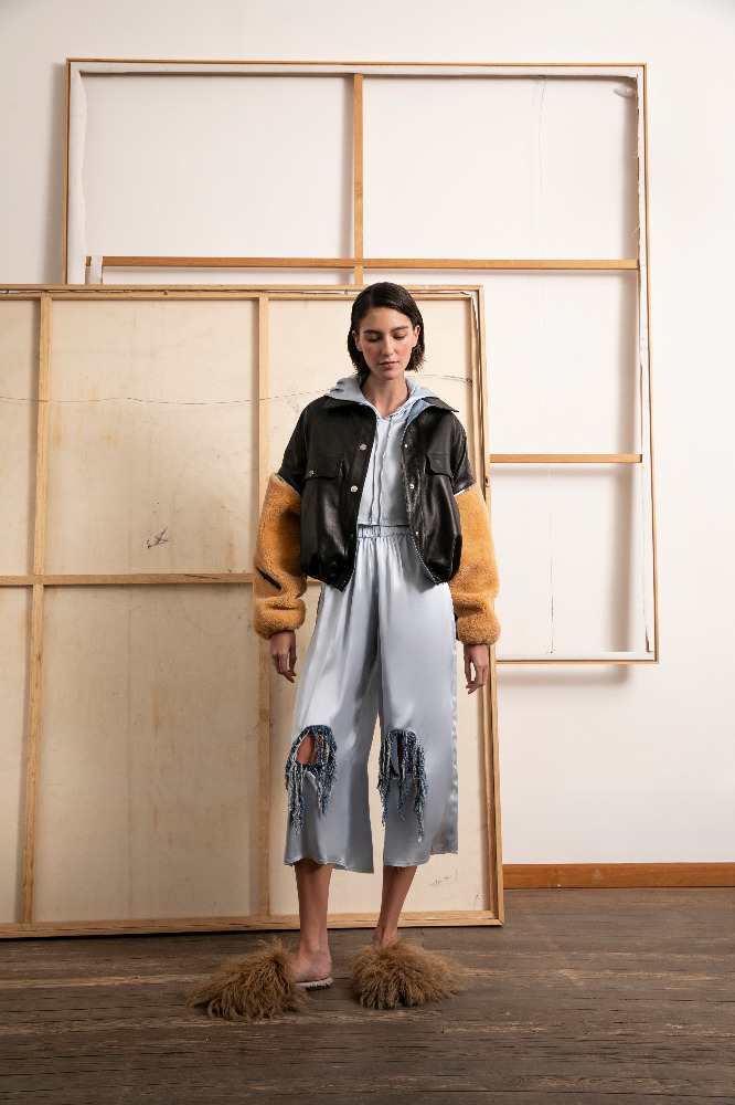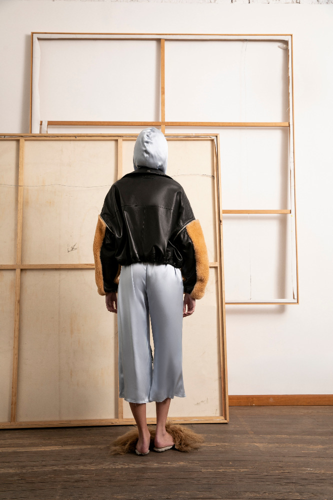 Black lamb skin leather Caramel shearling sleeves poliester lining Silver zippers