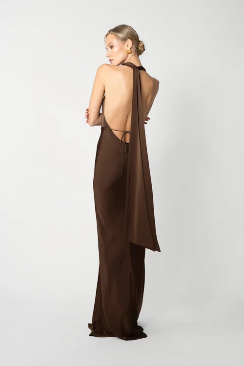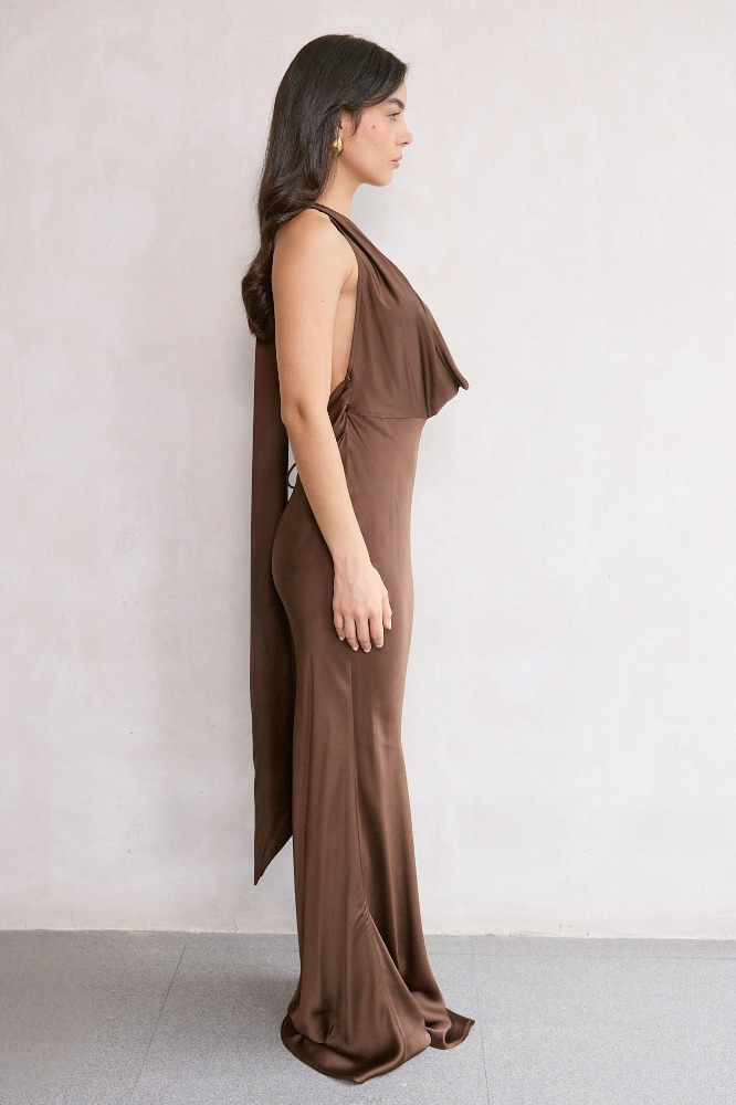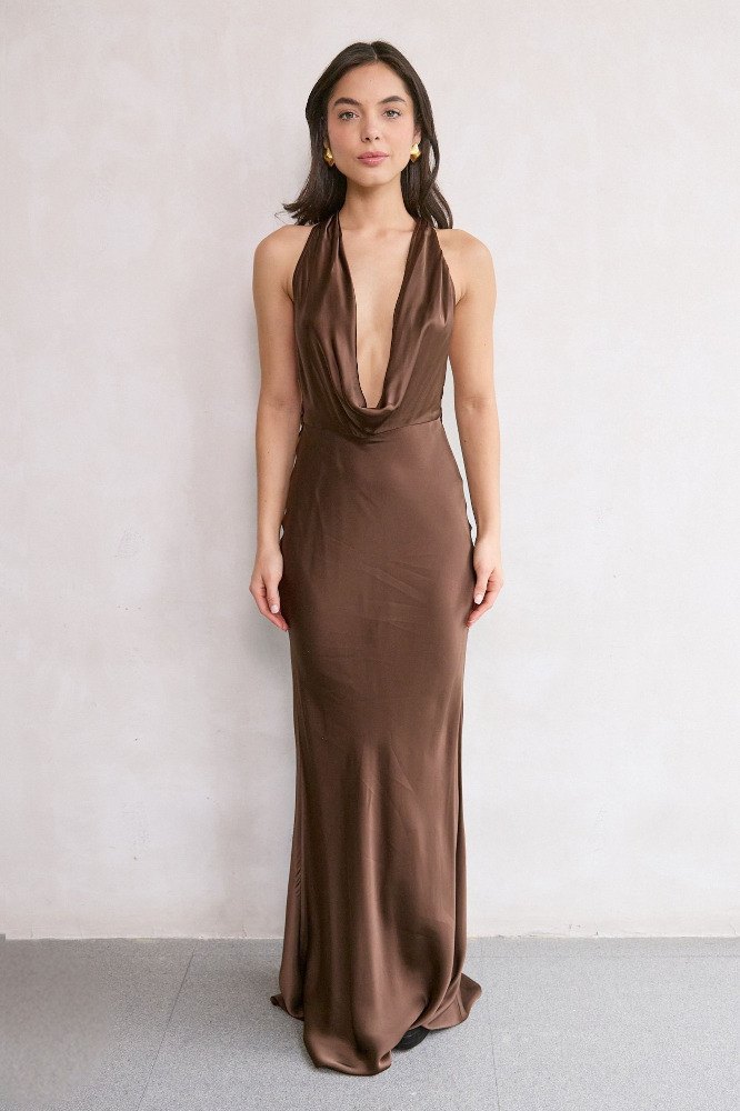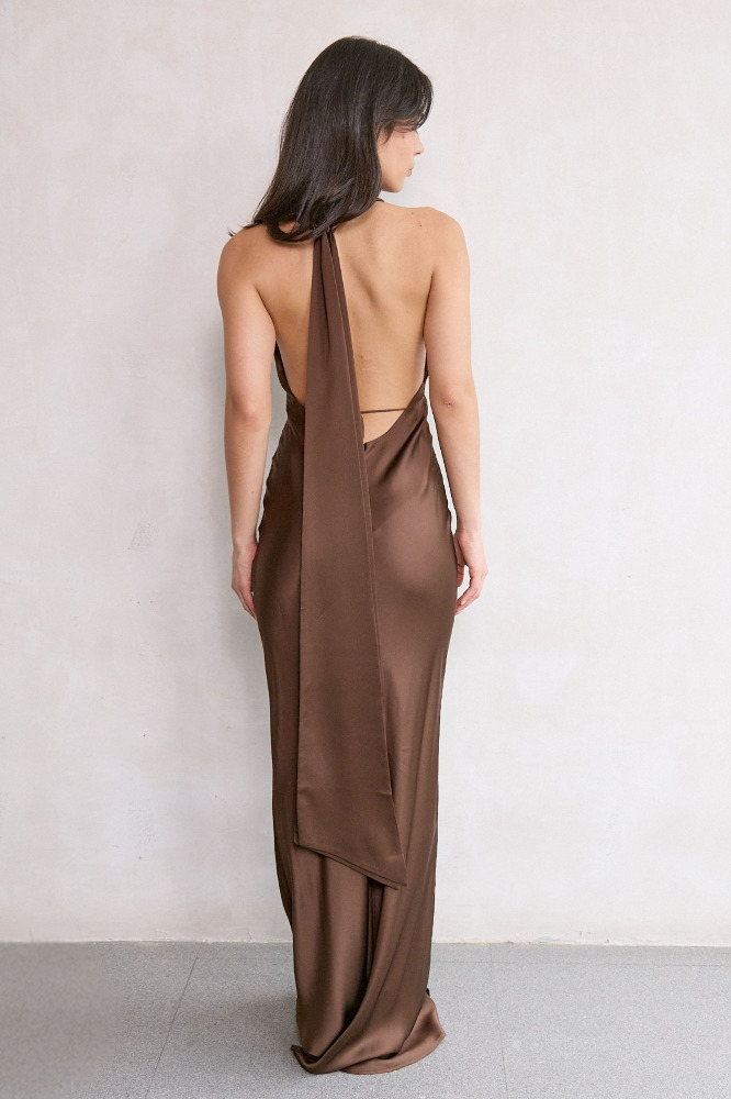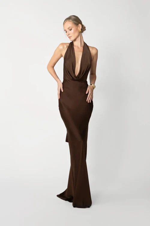 Halter gown crafted from lighter-weight satin in bias-cut fit with cowl neckline featuring elongated statement wings that drape from the back of the neck.