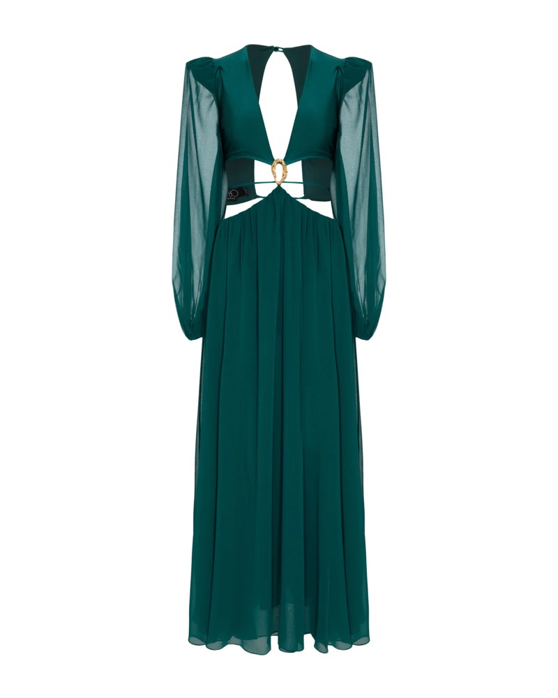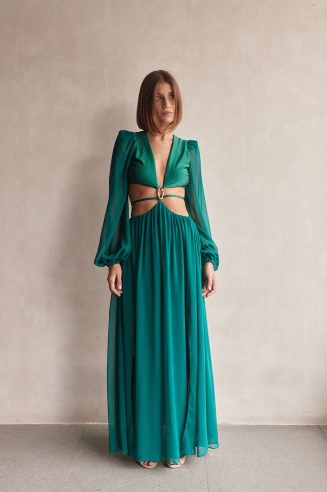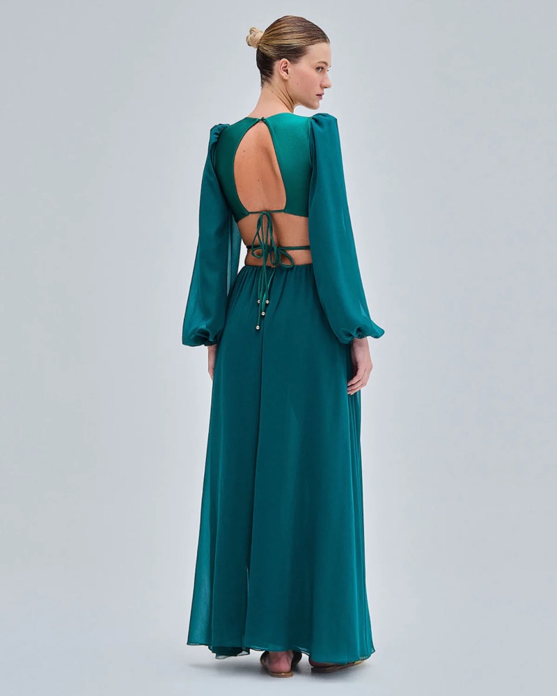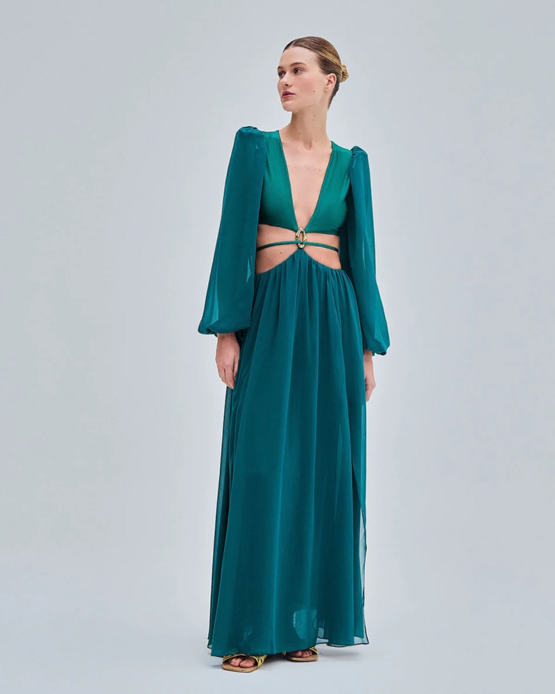 This flowy dress in lycra and chiffon fabric features a ribcage cut-out with tie details. Ballon sleeves and v-neck neckline.