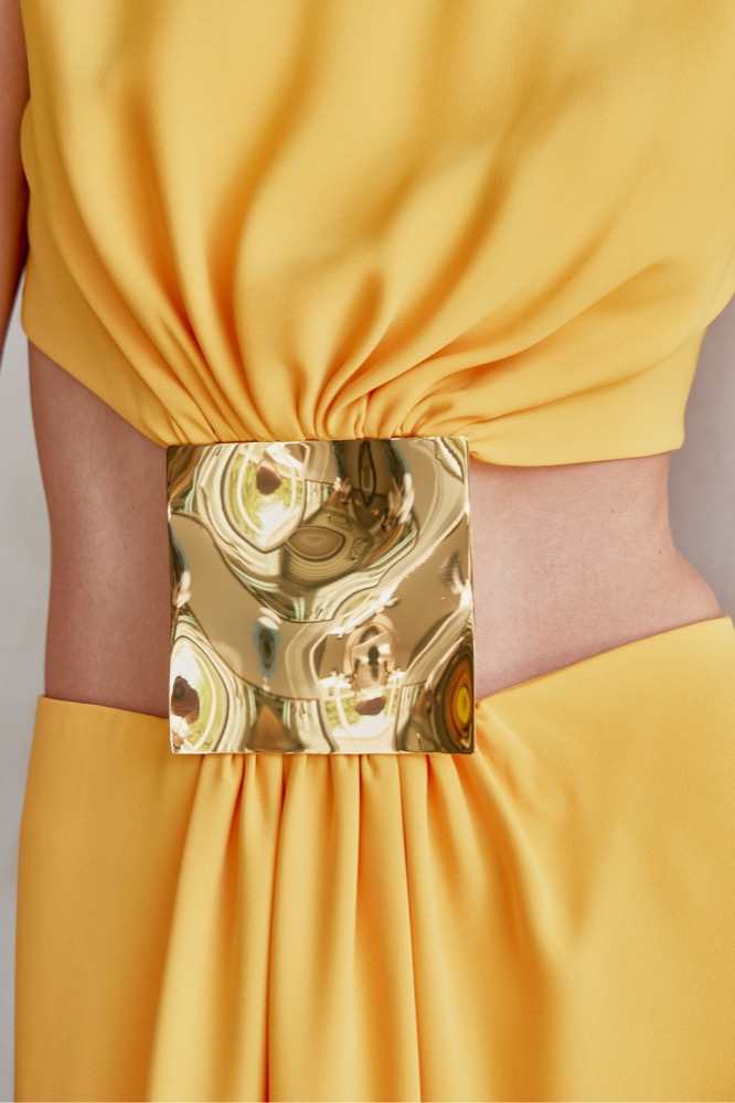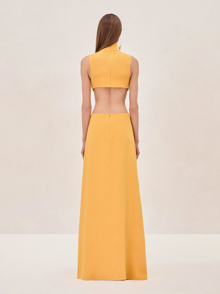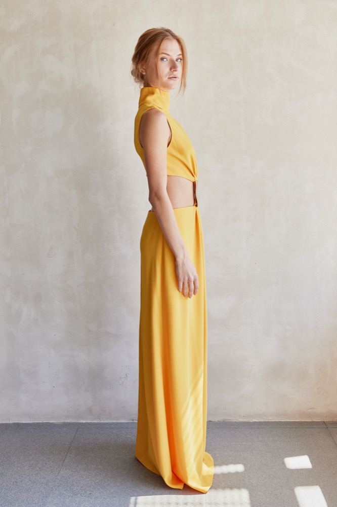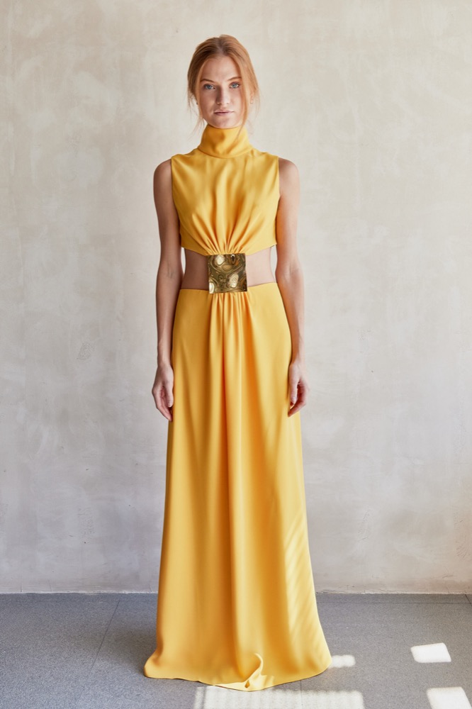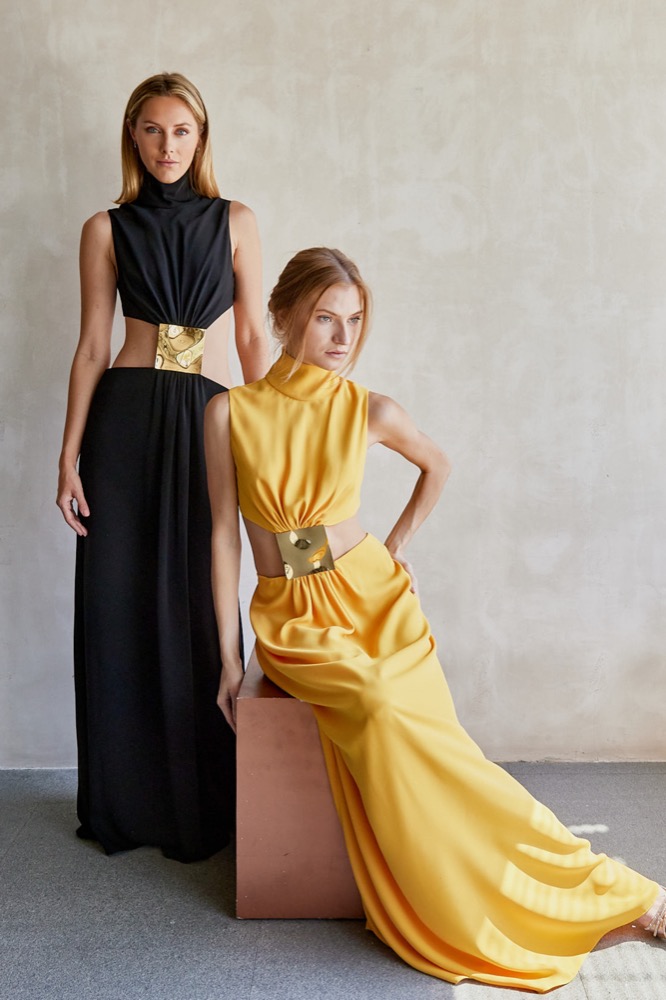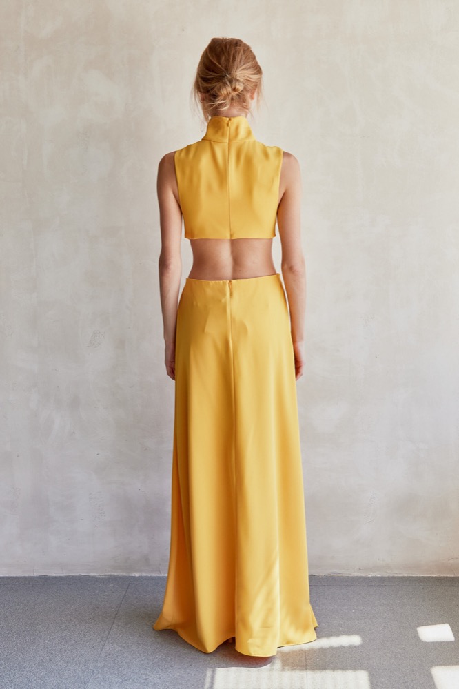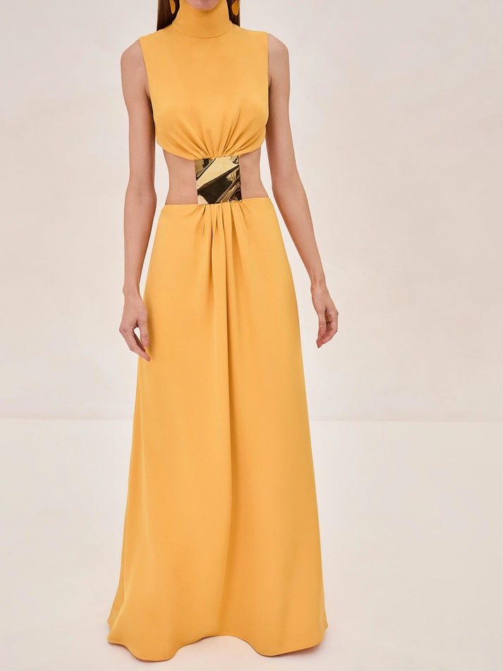 The Prague Dress—a bold and contemporary piece that effortlessly merges elegance with a daring edge. This dress features a high neckline and a unique cut-out design that creates a striking silhouette. The fitted bodice transitions into a flowing skirt, connected by a distinctive gold detail at the waist. Whether for an evening event or a special occasion, this dress is sure to turn heads.