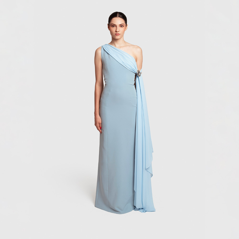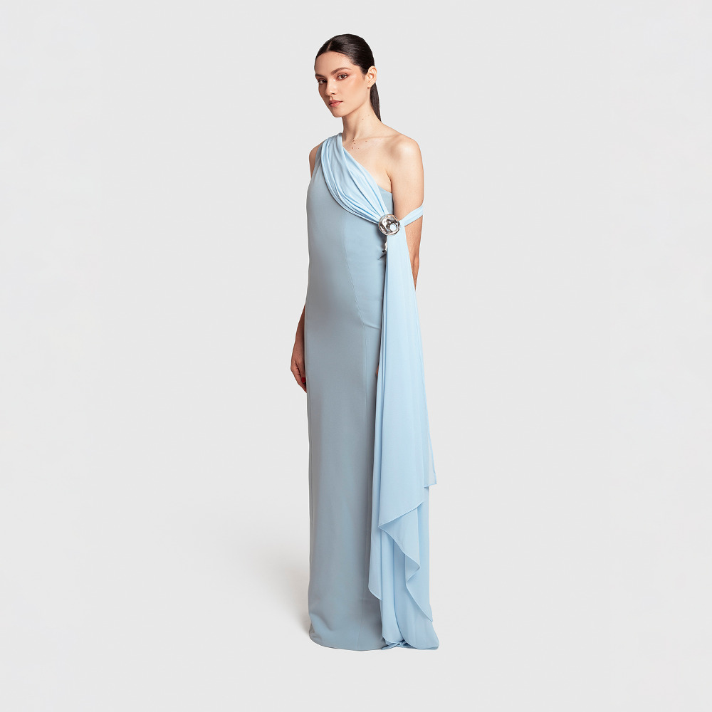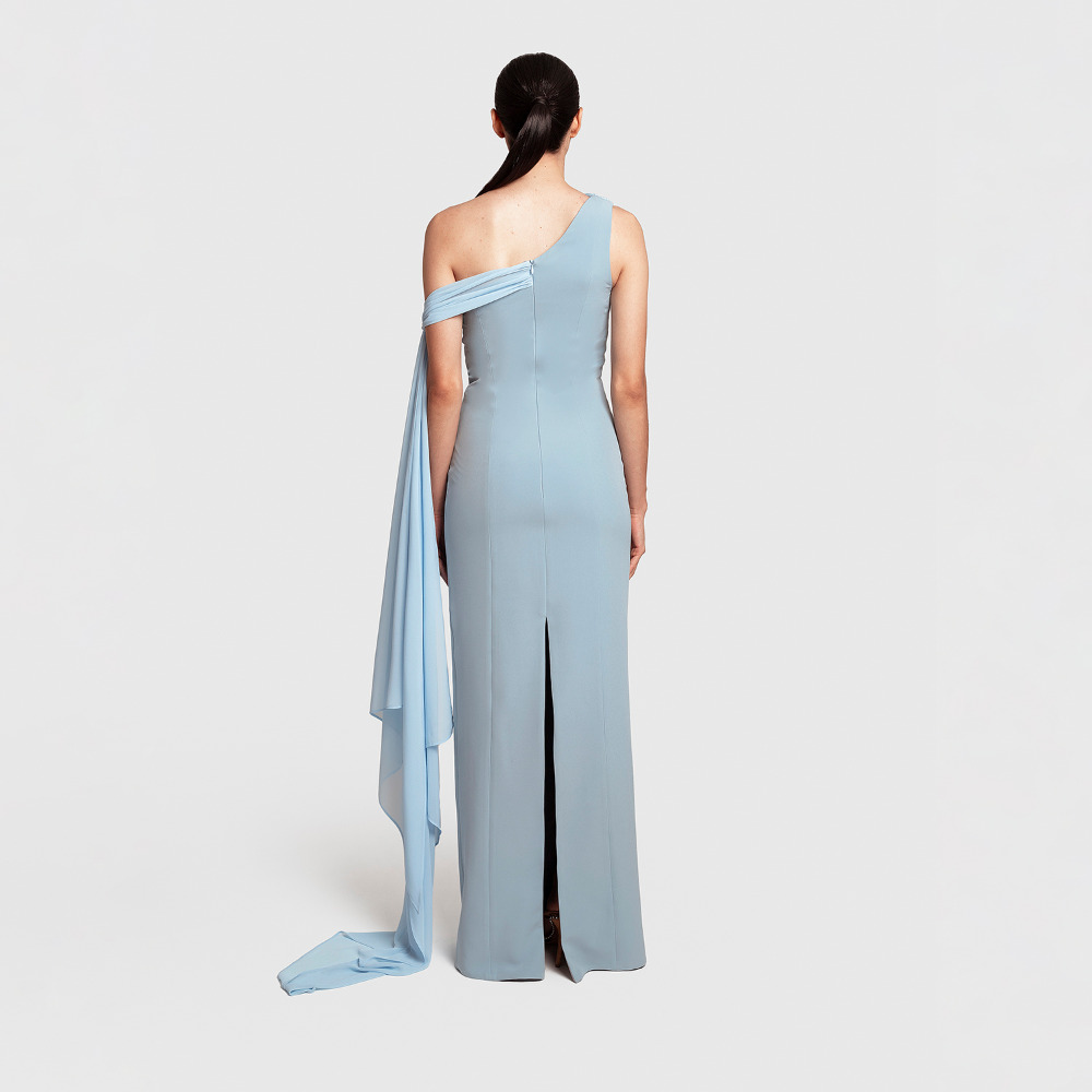 Un vestido digno de diosas. Corte recto con una capa de tul y diseño de un solo hombro. Cierre trasero.