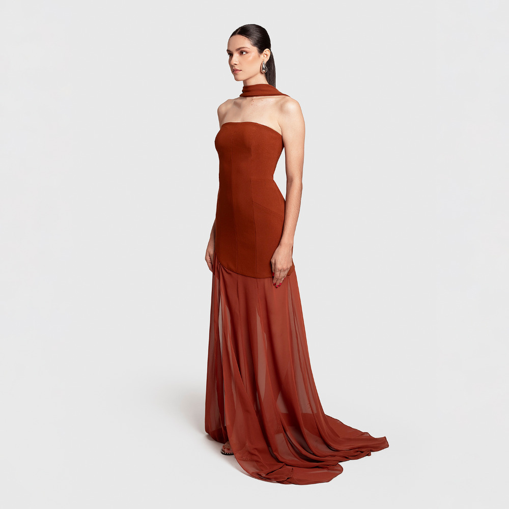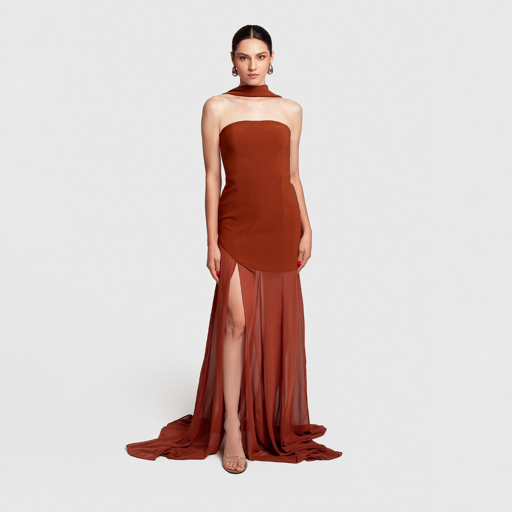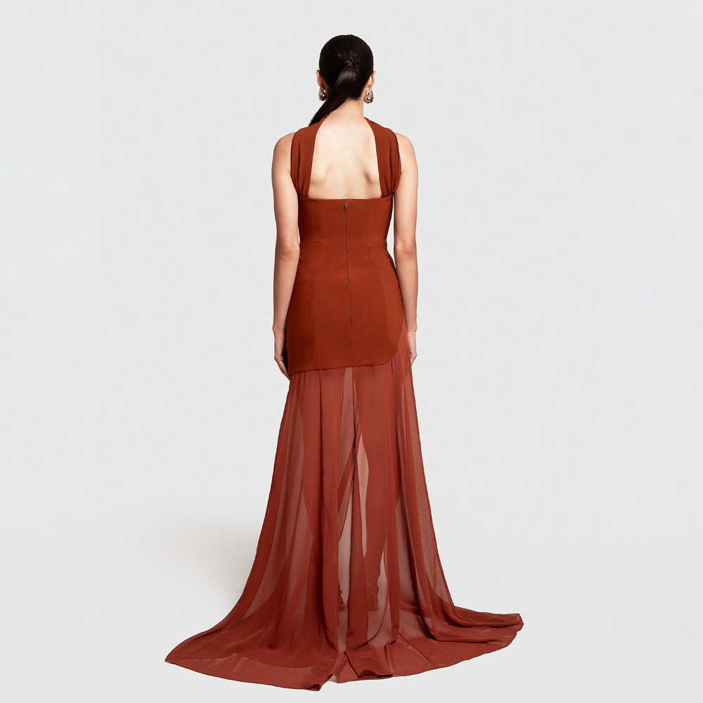 Strapless ajustado con falda de tul a la altura del muslo. Incluye una tela que envuelve el cuello y los hombros para un efecto choker en el frente y relajado en la espalda. Cierre trasero.