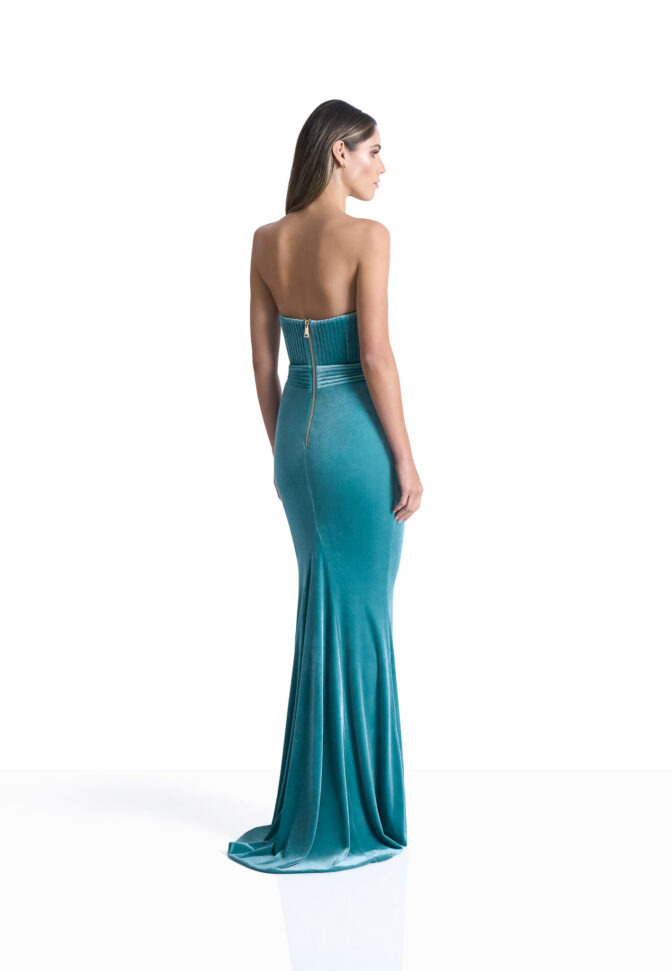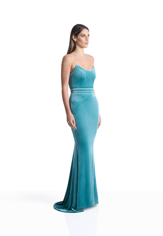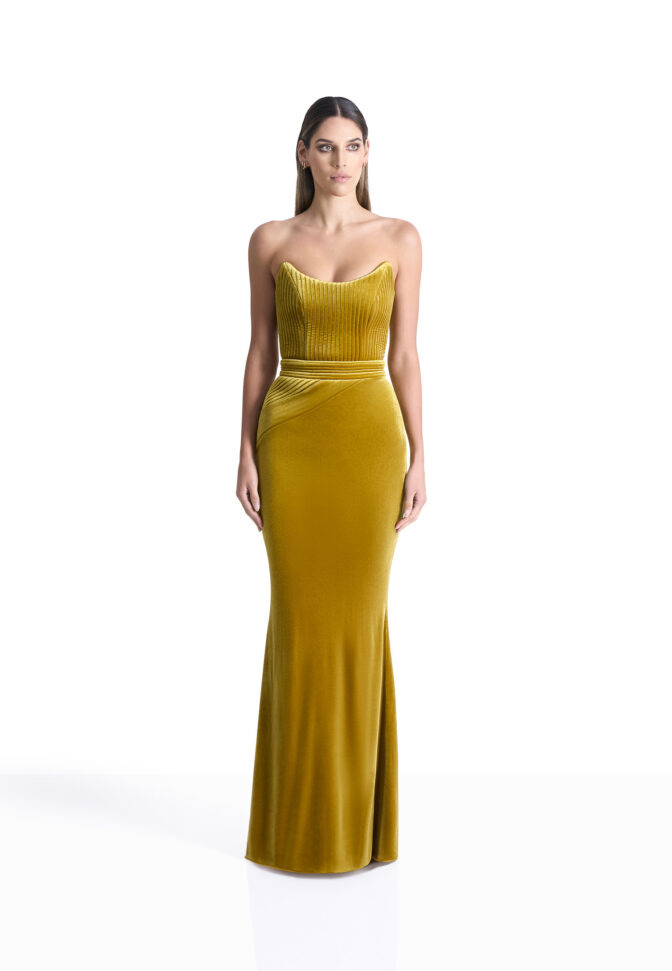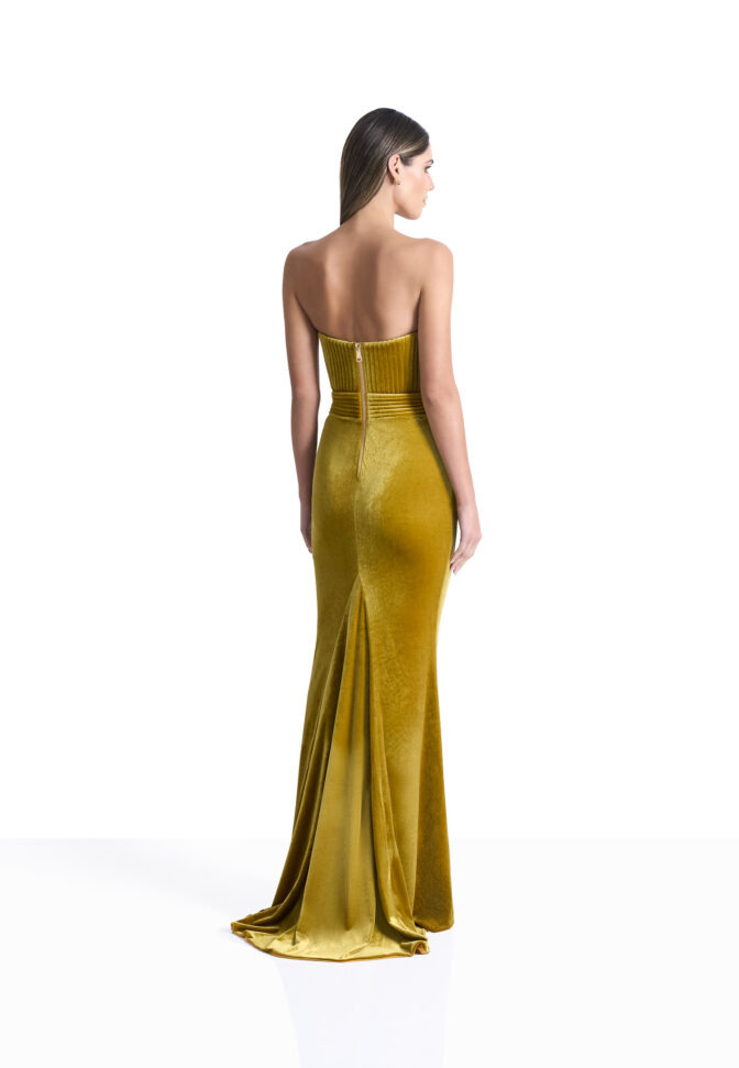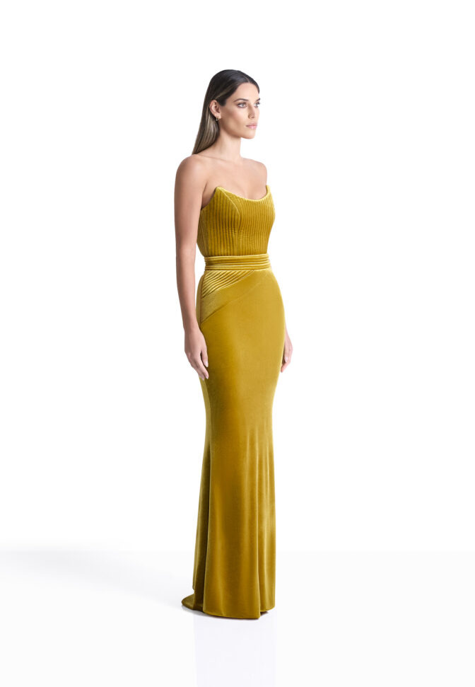 A VELVET STRAPLESS GOWN WITH STITCHED STRUCTURED BODICE AND HIP PANELLING
