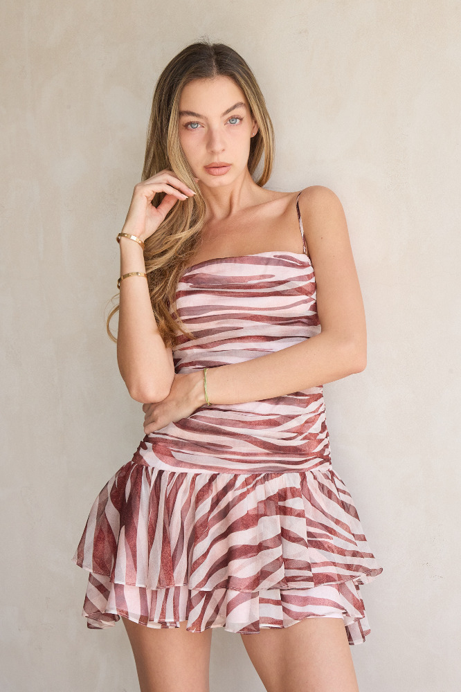 Elevate your wardrobe with the Shaniece Dress. This luxurious aline mini dress features a stunning zebra print, perfect for any occasion. Crafted from smooth silk, this dress exudes sophistication and elegance. Make a statement in this exclusive piece.
