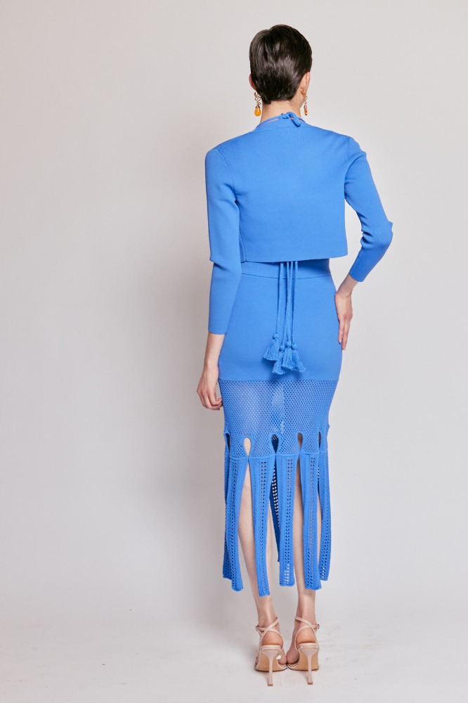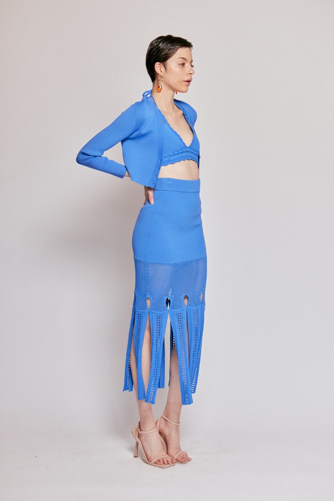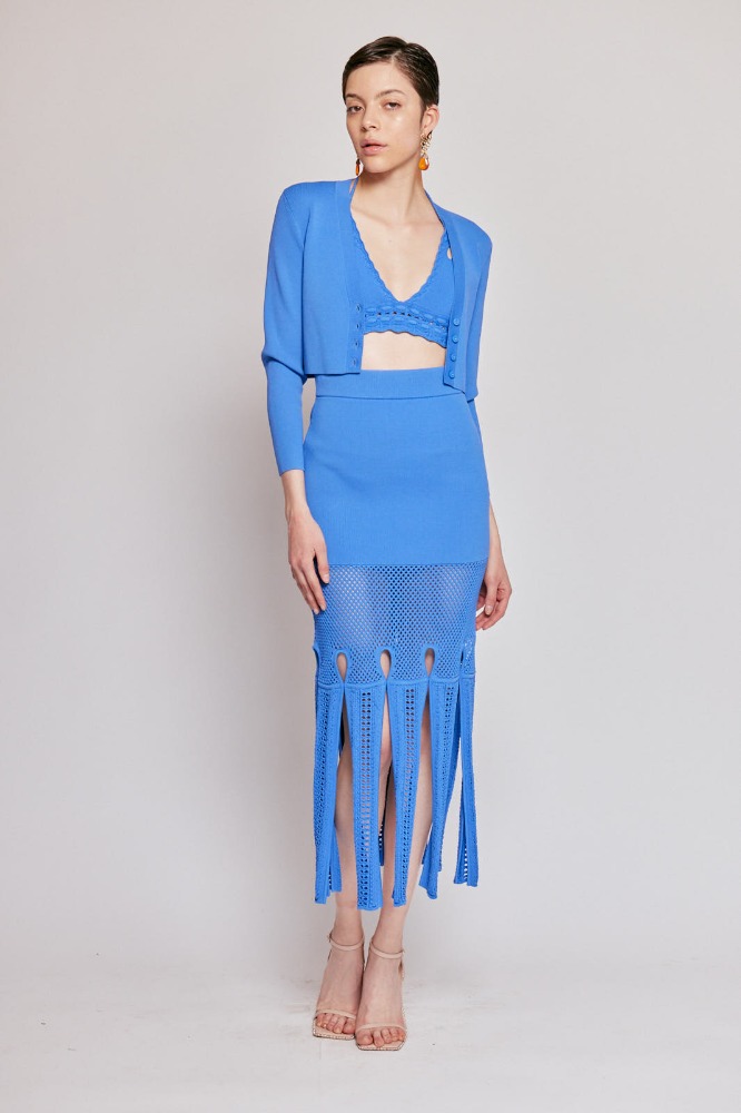 The Smyth is your new micro cardigan. Cut in a compact knit, the cropped silhouette features fitted three-quarter sleeves. Style it open with the Buras bra top and Kiara skirt or closed with your favorite pair of high-waisted jeans.
