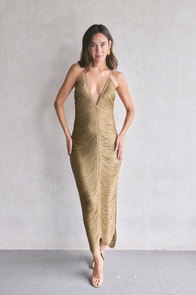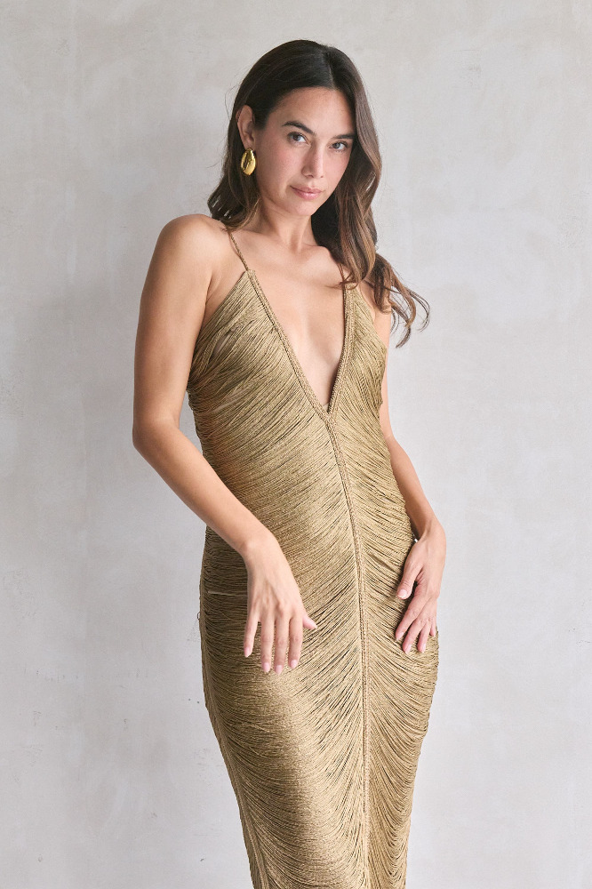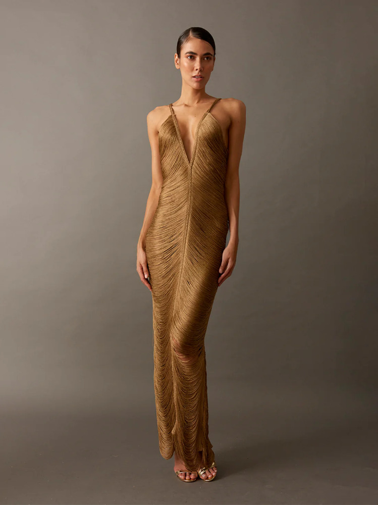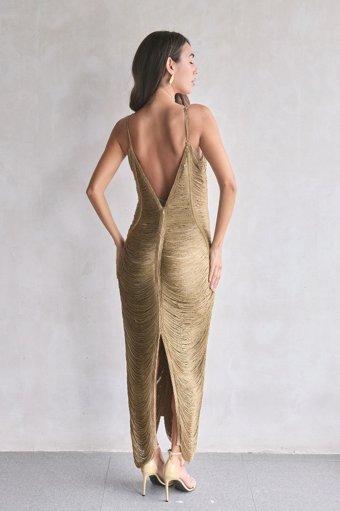An iconic piece from our artisanal luxury line, this long dress in aged gold tone redefines the fringe art with a silhouette that hugs the body and elevates it. Each strand is hand-sewn to create a wavy movement that mimics water cascading over the skin, enhancing elegance and sensuality. The deep V neckline and open back add a touch of ethereal sophistication, while the back slit allows ease of movement and a subtle hint of boldness.